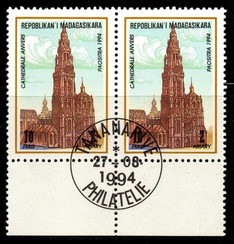 MADAGASKAR 27. Agustos.1994 Ünlü Dünya Katedrallerinden Cathedrale Anvers 10 FMG / 2 Ariary Belçika, Anvers (Antwerp) Katedrali. Serinin en düşük değerli puludur ancak dikey yapısıyla görseli çok şıktır. CTO (Cancelled-to-Order) dediğimiz, pulların üzerine basım aşamasında veya hemen sonrasında, koleksiyon amacıyla vurulan "Tananarive Philatelie" (Antananarivo Filateli Şubesi) damgasını taşıyor. 27-08-1994. "İlk Gün" (FDC) veya özel tanıtım damgası olduğunu gösterir. Para Birimi ; Pullar çift birimlidir; hem FMG (Frang Malgaş) hem de Ariary değerlerini taşır.
