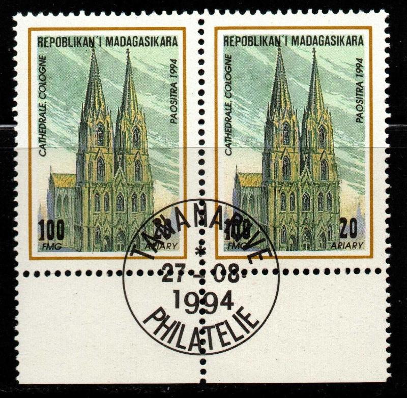 MADAGASKAR 27. Agustos.1994 Ünlü Dünya Katedrallerinden Cathedrale Cologne 100 FMG / 20 Ariary Almanya'daki ünlü Köln Katedrali. Gotik mimari temalı koleksiyonlarda aranır. CTO (Cancelled-to-Order) dediğimiz, pulların üzerine basım aşamasında veya hemen sonrasında, koleksiyon amacıyla vurulan "Tananarive Philatelie" (Antananarivo Filateli Şubesi) damgasını taşıyor. 27-08-1994. "İlk Gün" (FDC) veya özel tanıtım damgası olduğunu gösterir. Para Birimi ; Pullar çift birimlidir; hem FMG (Frang Malgaş) hem de Ariary değerlerini taşır.