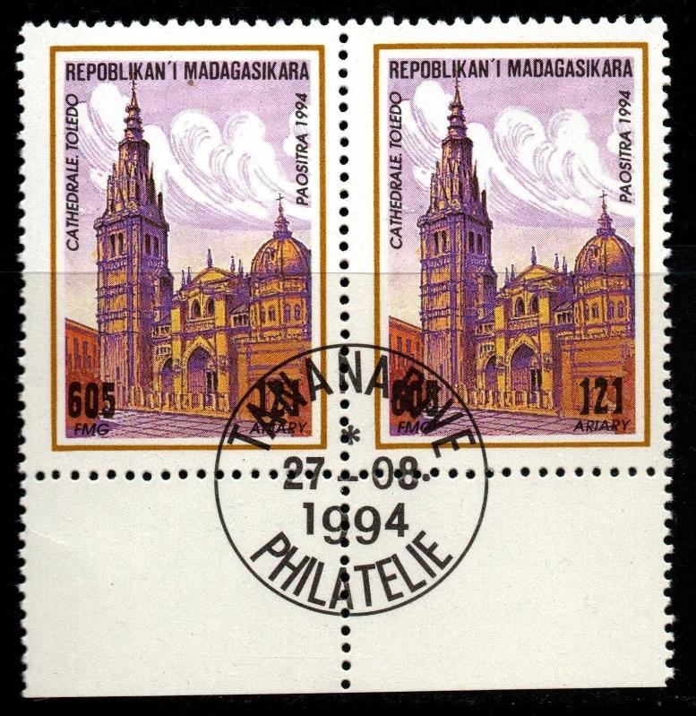 MADAGASKAR 27. Agustos.1994 Ünlü Dünya Katedrallerinden Cathedrale Toledo 605 FMG / 121 Ariary İspanya'daki Toledo Katedrali. Serinin yüksek nominal değerli pullarından biridir. CTO (Cancelled-to-Order) dediğimiz, pulların üzerine basım aşamasında veya hemen sonrasında, koleksiyon amacıyla vurulan "Tananarive Philatelie" (Antananarivo Filateli Şubesi) damgasını taşıyor. 27-08-1994. "İlk Gün" (FDC) veya özel tanıtım damgası olduğunu gösterir. Para Birimi ; Pullar çift birimlidir; hem FMG (Frang Malgaş) hem de Ariary değerlerini taşır.