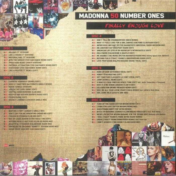 A1 Madonna– Holiday (7" Version) 4:20 A2 Madonna– Like A Virgin (7" Version) 3:39 A3 Madonna– Material Girl (7" Version) 4:01 A4 Madonna– Into The Groove (You Can Dance Remix Edit) 4:47 B1 Madonna– Open Your Heart (Video Version) 4:28 B2 Madonna– Physical Attraction (You Can Dance Remix Edit) 3:45 B3 Madonna– Everybody (You Can Dance Remix Edit) 4:34 B4 Madonna– Like A Prayer (7" Remix/Edit) 5:43 C1 Madonna– Express Yourself (Remix/Edit) 5:02 C2 Madonna– Keep It Together (Alternate Single Remix) 4:55 C3 Madonna– Vogue (Single Version) 4:21 C4 Madonna– Justify My Love (Orbit Edit) 4:33 D1 Madonna– Erotica (Underground Club Mix) 4:54 D2 Madonna– Deeper And Deeper (David's Radio Edit) 4:04 D3 Madonna– Fever (Radio Edit) 5:09 D4 Madonna– Secret (Junior's Luscious Single Mix) 4:15 E1 Madonna– Bedtime Story (Junior's Single Mix) 4:55 E2 Madonna– Don't Cry For Me Argentina (Miami Mix Edit) 4:30 E3 Madonna– Frozen (Extended Club Mix Edit) 4:38 E4 Madonna– Ray Of Light (Sasha Ultra Violet Mix Edit) 5:07 F1 Madonna– Nothing Really Matters (Club 69 Radio Mix) 3:45 F2 Madonna– Beautiful Stranger (Calderone Radio Mix) 4:05 F3 Madonna– American Pie (Richard "Humpty" Vission Radio Mix) 4:27 F4 Madonna– Music (Deep Dish Dot Com Radio Edit) 4:14 G1 Madonna– Don't Tell Me (Thunderpuss Video Remix) 4:08 G2 Madonna– What It Feels Like For A Girl (Above & Beyond Club Radio Edit) 3:44 G3 Madonna– Impressive Instant (Peter Rauhofer's Universal Radio Mixshow Mix) 5:33 G4 Madonna– Die Another Day (Deepsky Radio Edit) 4:08 H1 Madonna– American Life (Felix Da Housecat's Devin Dazzle Edit) 3:22 H2 Madonna– Hollywood (Calderone & Quayle Edit) 4:02 H3 Britney Spears Feat. Madonna– Me Against The Music (Peter Rauhofer Radio Mix) 3:44 H4 Madonna– Nothing Fails (Tracy Young's Underground Radio Edit) 4:32 H5 Madonna– Love Profusion (Ralphi Rosario House Vocal Edit) 3:58 I1 Madonna– Hung Up (SDP Extended Vocal Edit) 4:59 I2 Madonna– Sorry (PSB Maxi Mix Edit) 4:33 I3 Madonna– Get Together (Jacques Lu Cont Vocal Edit) 4:23 I4 Madonna– Jump (Axwell Remix Edit) 4:45 J1 Madonna Feat. Justin Timberlake & Timbaland– 4 Minutes (Bob Sinclar Space Funk Edit) 3:24 J2 Madonna– Give It 2 Me (Eddie Amador Club 5 Edit) 4:56 J3 Madonna– Celebration (Benny Benassi Remix Edit) 3:59 J4 Madonna Feat. LMFAO & Nicki Minaj– Give Me All Your Luvin' (Party Rock Remix) 4:02 J5 Madonna– Girl Gone Wild (Avicii's UMF Mix) 5:15 K1 Madonna– Turn Up The Radio (Offer Nissim Remix Edit) 4:55 K2 Madonna– Living For Love (Offer Nissim Promo Mix) 5:53 K3 Madonna– Ghosttown (Dirty Pop Intro Remix) 5:21 K4 Madonna Feat. Nicki Minaj– Bitch I'm Madonna (Sander Kleinenberg Video Edit) 3:22 L1 Madonna And Maluma– Medellín (Offer Nissim Madame X In The Sphinx Mix) 5:29 L2 Madonna– I Rise (Tracy Young's Pride Intro Radio Remix) 3:52 L3 Madonna Feat. Swae Lee– Crave (Tracy Young Dangerous Remix) 4:47 L4 Madonna– I Don't Search I Find (Honey Dijon Radio Mix) 5:22 2023 PLAK BOX SET AMBALAJINDADIR KARGO SÜRESİ EN AZ İKİ HAFTADIR