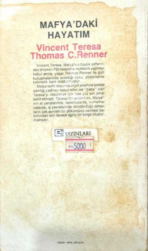 MAFYA'DAKİ HAYATIM, VINCENT TERESA, T. C. RENNER tarafından kaleme alınmıştır. Kitap 1984 yılında E YAYINLARI tarafından [İSTANBUL ] yayınlanmıştır. 360 sayfadır. MAFYA'DAKİ HAYATIM adlı eser Türkçe dilindedir.
