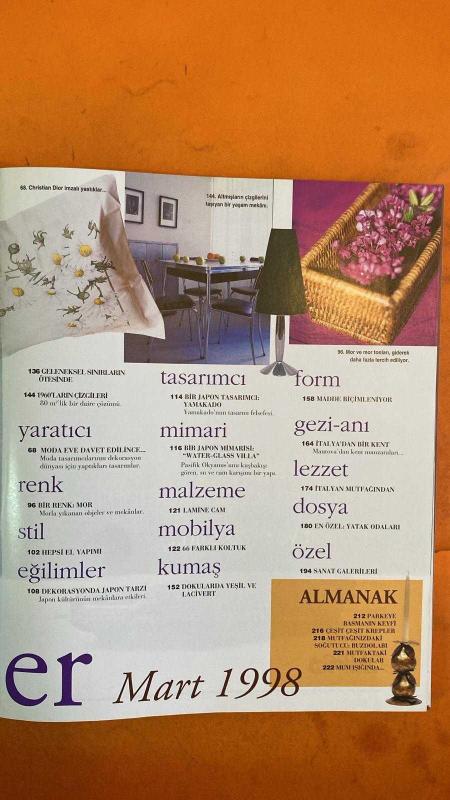 Kitap DİNÇBİLGİN tarafından yayınlanmıştır. 228 sayfadır. MAISON FRANÇAISE DERGİSİ - MART 1998 - MELDA NARMANLI ÇİMEN – HIROYUKI YAMAKADO – CHRISTIAN DIOR – RALPH LAUREN – KENZO – CALVIN KLEIN – BALKAN NACİ İSLİMYELİ – MEHMET GÜRELİ – FATMA TÜLİN – KEZBAN ARCA BATIBEKİ – JALE N. ERZEN – LOLITA ASİL – FİKRET MUALLA – EROL BULUT - MODANIN YILDIZLARIYLA DEKORASYON – RALPH LAUREN, KENZO, VERSACE, DIOR – EL YAPIMI OBJELER – TASARIMDA JAPON TARZI – YATAK ODALARI – ŞANAT GALERİLERİ – RENK: MOR – DEKORASYONDA ÇİÇEKLER – 1960'LARIN ÇİZGİLERİ – WATER-GLASS VILLA – DOKULARDA YEŞİL VE LACİVERT – MADDE BİÇİMLENİYOR – ITALYAN MUTFAĞI – PARKELER – MUM IŞIĞINDA – MANTOVA’DAN KENT MANZARALARI – CITY DESIGN – BİR AİLE EVİ – BİR GAZETECİ EVİ – VE PERDE... BALE SAHNESİNDEN EVE - MODA EVE DAVET EDİLİNCE – DEKORASYONDA JAPON TARZI – BİR JAPON TASARIMCI: YAMAKADO – BİR JAPON MİMARİSİ: WATER-GLASS VILLA – TASARIMDA ZEN – SANAT VE İÇ MEKÂN SENTEZİ – 66 FARKLI KOLTUK – LAMİNE CAM – OBJELER BİÇİM KAZANIYOR – MOR TONLARDA DEKORASYON - MEHMET GÜRELİ – BALK - 228 SAYFA adlı eser Türkçe dilindedir.