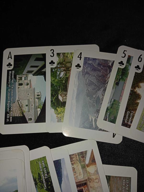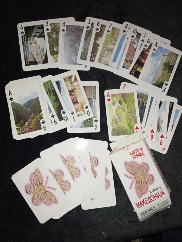 MAKEDONYA TEMALI KOLEKSİYONLUK OYUN KARTI DESTESİ 1 kart eksik 51 farklı görsel Makedonya’nın tarihi ve doğal güzellikleri. Temiz ve kullanılabilir durumda koleksiyonluk. Fotoğraflı özel seri olduğu için klasik iskambil kartlarından değil Koleksiyon yapanlara, farklı şeyler sevenlere veya hediye düşünenlere güzel parça