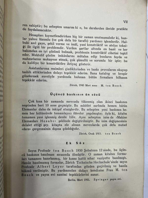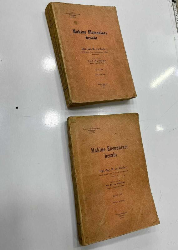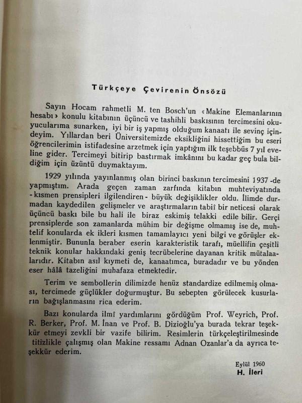 984+XXV sayfa. 16.5x25 cm zaman eskimesi, isim yazılı, kapakta yıpranma, sayfa cildi sağlam, ama şefkatli okunmalı “(Maschinenelemente-1940) 2.baskının neşrinden beri 10 yıl geçmiştir.() yeni baskı kitaba,() tamamen yeni işlenmiş denilebilir.Aynı sebepten isim de,‘Berechnung der Maschinenelemente’ şeklinde değiştirilmiştir..”-ten Bosch/Ocak 1950-3.baskı önsözü “Prof.Bosch1950 Şubatında,3.baskı sırasında ölmüştür.() Henüz basılmamış formalar, Prof. Albert Leyer tarafından gözden geçirilmiş ve basıla hükmü verilmiştir..”-eksöz Ord.Prof. Hilmi İleri,1926 İstanbul Yüksek Mühendis Okulu'na kaydoldu,1934 Zürih Teknik Üniversitesindem mezun oldu.1938-1939 Yıldız Teknik Okulu'nda makine bölümünün kuruluşunda çalıştı.1944 İstanbul Teknik Üniversitesi'ne dönüştürülen ‘Yüksek Mühendis Okulu' makine fakültesinin hazırlıklarını yaptı ve makine elemanları kürsüsüne profesör olarak atandı. Selim İleri'nin babası https://www.wikipedia.tr-tr.nina.az/Hilmi_%C4%B0leri.html
