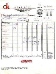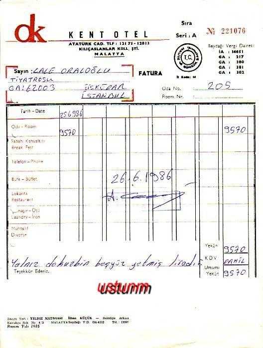 ** MALATYA KENT OTEL FATURASI ** 26 Haziran 1986 tarihinde, Lale Oraloğlu Tiyatrosu adına kesilmiş, otel konaklama bedeli faturasıdır... Bu otel kapanmıştır,şimdi hastane olarak faaliyettedir...
