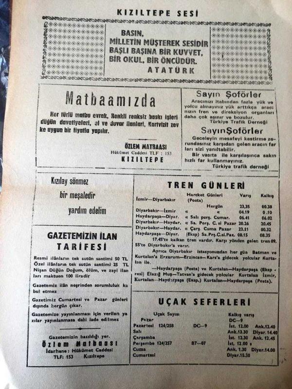 MARDİN KIZILTEPE SESİ BAĞIMSIZ SİYASİ GAZETE -YEREL TAŞRA BASINI - 11 EYLÜL 1978 -SAYI :1475-Sınai Mamul ihracı konusunda sanayicilerle bir dizi toplantı düzenlendi -Antakya 'nın yeni otomotik telefon santrali yakında hizmete girecek -Van toptancı halı , çöplük yuvasına döndü -Yağışlı hava ,yerini ılık ve güneşli günlere bırakıyor -Gazetemizin ilan tarifesi - Yıpranma, sararmalar, kupon kesiği ve yırtılmalar zamana bağlı olarak görülebilir.