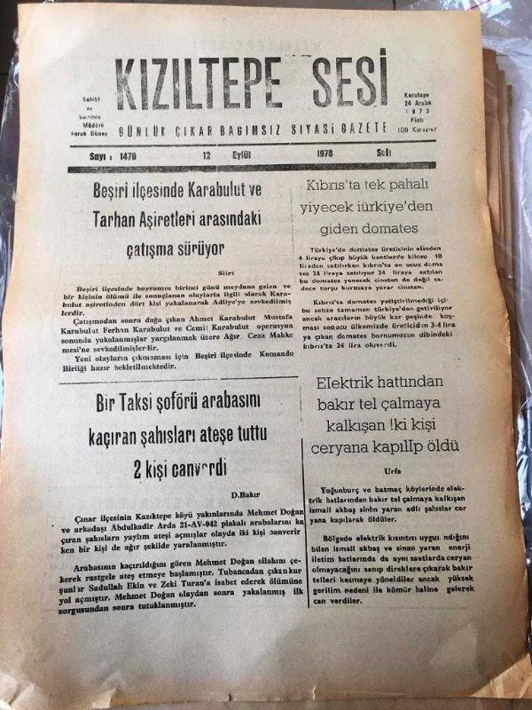 MARDİN KIZILTEPE SESİ BAĞIMSIZ SİYASİ GAZETE -YEREL TAŞRA BASINI - 12 EYLÜL 1978- SAYI :1476-Beşiri ilçesinde Karabulut ve Tarhan Aşiretleri arasındaki çatışma sürüyor -Bir Taksi şoförü arabasını kaçıran şahısları ateşe tuttu 2 kişi can verdi -Kıbrıs 'ta tek pahalı yiyecek Türkiye'den giden domates- Elektrik hattından bakır tel çalmaya kalkışan iki kişi ceryana kapılıp öldü-Gazetemizin ilan tarifesi Yıpranma, sararmalar, kupon kesiği ve yırtılmalar zamana bağlı olarak görülebilir.