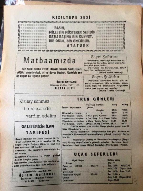 MARDİN KIZILTEPE SESİ BAĞIMSIZ SİYASİ GAZETE -YEREL TAŞRA BASINI - 12 EYLÜL 1978- SAYI :1476-Beşiri ilçesinde Karabulut ve Tarhan Aşiretleri arasındaki çatışma sürüyor -Bir Taksi şoförü arabasını kaçıran şahısları ateşe tuttu 2 kişi can verdi -Kıbrıs 'ta tek pahalı yiyecek Türkiye'den giden domates- Elektrik hattından bakır tel çalmaya kalkışan iki kişi ceryana kapılıp öldü-Gazetemizin ilan tarifesi, FARUK GÜNEŞ tarafından kaleme alınmıştır. Kitap 1972 yılında [ÖZLEM MATBAASI] yayınlanmıştır. 2 sayfadır. MARDİN KIZILTEPE SESİ BAĞIMSIZ SİYASİ GAZETE -YEREL TAŞRA BASINI - 12 EYLÜL 1978- SAYI :1476-Beşiri ilçesinde Karabulut ve Tarhan Aşiretleri arasındaki çatışma sürüyor -Bir Taksi şoförü arabasını kaçıran şahısları ateşe tuttu 2 kişi can verdi -Kıbrıs 'ta tek pahalı yiyecek Türkiye'den giden domates- Elektrik hattından bakır tel çalmaya kalkışan iki kişi ceryana kapılıp öldü-Gazetemizin ilan tarifesi adlı eser Türkçe dilindedir.