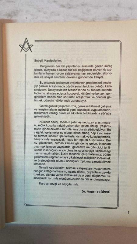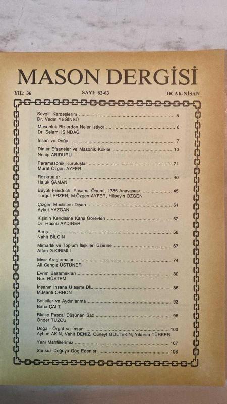 MASON DERGİSİ - OCAK - NİSAN 1987 SAYI: 62-63 DR. VEDAT YEĞİNSÜ - DR. SELAMİ IŞINDAĞ - NECİP ARIDURU - MURAT ÖZGEN AYFER - HALUK ŞAMAN - TURGUT ERZEN - HÜSEYİN ÖZGEN - AYKUT YAZGAN - DR. HÜSNÜ AYDINER - NAHİT BİLGİN - AFFAN G. KIRIMLI - ALİ CENGİZ ÜSTÜNER - NURİ RÜSTEM - M. MARİFİ ORHON - BAHA ÇALT - ÖNDER TUZCU - AYHAN AKIN - VAHİT DENİZ - CÜNEYT GÜLTEKİN - YILDIRIM TÜRKERİ - ERDOĞAN ERSEN - MEHMET TOSUN - HALUK YÜCELİR - DÜNDAR ZAİM - ZİYA HÜNERMAN - TURHAN ÇETİNTÜRK - YURDAER ACAR SEVGİLİ KARDEŞLERİM - MASONLUK BİZLERDEN NELER İSTİYOR - İNSAN VE DOĞA - DİNLER EFSANELER VE MASONİK KÖKLER - PARAMASONİK KURULUŞLAR - ROZKRUALAR - BÜYÜK FRIEDRICH YAŞAMI ÖNEMİ 1786 ANAYASASI - ÇİZGİM MECLİSTEN DIŞARI - KİŞİNİN KENDİSİNE KARŞI GÖREVLERİ - BARIŞ - MİMARLIK VE TOPLUM İLİŞKİLERİ ÜZERİNE - MISIR ARAŞTIRMALARI - EVRİM BASAMAKLARI - İNSANIN İNSANA ULAŞIMI DİL - SOFİSTLER VE AYDINLANMA - BLAISE PASCAL DÜŞÜNEN SAZ - DOĞA ÖRGÜT VE İNSAN - YENİ MAHFİLLERİMİZ - SONSU - TAM TAKIM EKSİKSİZ 64 SAYFA, REVUE MAÇONNIQUE tarafından kaleme alınmıştır. MASON DERGİSİ - OCAK - NİSAN 1987 SAYI: 62-63 DR. VEDAT YEĞİNSÜ - DR. SELAMİ IŞINDAĞ - NECİP ARIDURU - MURAT ÖZGEN AYFER - HALUK ŞAMAN - TURGUT ERZEN - HÜSEYİN ÖZGEN - AYKUT YAZGAN - DR. HÜSNÜ AYDINER - NAHİT BİLGİN - AFFAN G. KIRIMLI - ALİ CENGİZ ÜSTÜNER - NURİ RÜSTEM - M. MARİFİ ORHON - BAHA ÇALT - ÖNDER TUZCU - AYHAN AKIN - VAHİT DENİZ - CÜNEYT GÜLTEKİN - YILDIRIM TÜRKERİ - ERDOĞAN ERSEN - MEHMET TOSUN - HALUK YÜCELİR - DÜNDAR ZAİM - ZİYA HÜNERMAN - TURHAN ÇETİNTÜRK - YURDAER ACAR SEVGİLİ KARDEŞLERİM - MASONLUK BİZLERDEN NELER İSTİYOR - İNSAN VE DOĞA - DİNLER EFSANELER VE MASONİK KÖKLER - PARAMASONİK KURULUŞLAR - ROZKRUALAR - BÜYÜK FRIEDRICH YAŞAMI ÖNEMİ 1786 ANAYASASI - ÇİZGİM MECLİSTEN DIŞARI - KİŞİNİN KENDİSİNE KARŞI GÖREVLERİ - BARIŞ - MİMARLIK VE TOPLUM İLİŞKİLERİ ÜZERİNE - MISIR ARAŞTIRMALARI - EVRİM BASAMAKLARI - İNSANIN İNSANA ULAŞIMI DİL - SOFİSTLER VE AYDINLANMA - BLAISE PASCAL DÜŞÜNEN SAZ - DOĞA ÖRGÜT VE İNSAN - YENİ MAHFİLLERİMİZ - SONSU - TAM TAKIM EKSİKSİZ 64 SAYFA adlı eser Türkçe dilindedir.