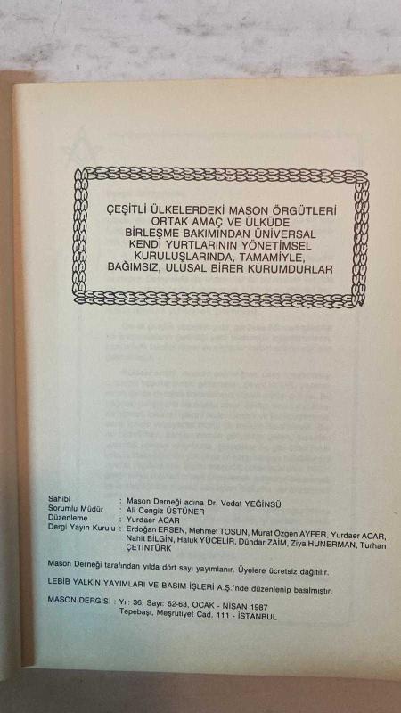 MASON DERGİSİ - OCAK - NİSAN 1987 SAYI: 62-63 DR. VEDAT YEĞİNSÜ - DR. SELAMİ IŞINDAĞ - NECİP ARIDURU - MURAT ÖZGEN AYFER - HALUK ŞAMAN - TURGUT ERZEN - HÜSEYİN ÖZGEN - AYKUT YAZGAN - DR. HÜSNÜ AYDINER - NAHİT BİLGİN - AFFAN G. KIRIMLI - ALİ CENGİZ ÜSTÜNER - NURİ RÜSTEM - M. MARİFİ ORHON - BAHA ÇALT - ÖNDER TUZCU - AYHAN AKIN - VAHİT DENİZ - CÜNEYT GÜLTEKİN - YILDIRIM TÜRKERİ - ERDOĞAN ERSEN - MEHMET TOSUN - HALUK YÜCELİR - DÜNDAR ZAİM - ZİYA HÜNERMAN - TURHAN ÇETİNTÜRK - YURDAER ACAR SEVGİLİ KARDEŞLERİM - MASONLUK BİZLERDEN NELER İSTİYOR - İNSAN VE DOĞA - DİNLER EFSANELER VE MASONİK KÖKLER - PARAMASONİK KURULUŞLAR - ROZKRUALAR - BÜYÜK FRIEDRICH YAŞAMI ÖNEMİ 1786 ANAYASASI - ÇİZGİM MECLİSTEN DIŞARI - KİŞİNİN KENDİSİNE KARŞI GÖREVLERİ - BARIŞ - MİMARLIK VE TOPLUM İLİŞKİLERİ ÜZERİNE - MISIR ARAŞTIRMALARI - EVRİM BASAMAKLARI - İNSANIN İNSANA ULAŞIMI DİL - SOFİSTLER VE AYDINLANMA - BLAISE PASCAL DÜŞÜNEN SAZ - DOĞA ÖRGÜT VE İNSAN - YENİ MAHFİLLERİMİZ - SONSU - TAM TAKIM EKSİKSİZ 64 SAYFA adlı eser, Kitap > Süreli Yayınlar > Dergiler > Magazin, Moda kategorisinde İkinci El olarak satıştadır.