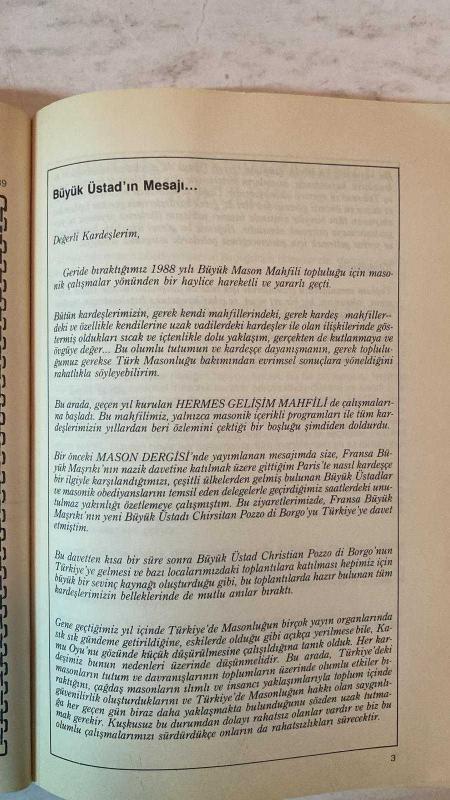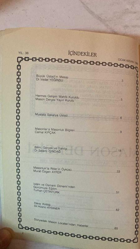 MASON DERGİSİ - OCAK-NİSAN 1989 YIL: 38 - DR. VEDAT YEĞİNSÜ - MUSTAFA SAKARYA - CEMAL KIPÇAK - DR. SELAMİ IŞINDAĞ - MURAT ÖZGEN AYFER - TURHAN ÇETİNTÜRK - DR. HÜSNÜ AYDINER - BÜYÜK ÜSTAD'IN MESAJI - HERMES GELİŞİM MAHFİLİ KURULDU - MASONLAR'A MASONLUK BİLGİLERİ - BİLİM, GERÇEK VE YANILGI - MASONLUK'TA RİTLER'İN ÖYKÜSÜ - İSLÂM VE OSMANLI DÖNEMİ'NDEN GÜNÜMÜZE EĞİTİM - HAVA KİRLİLİĞİ - DÜNYADAKİ MASON LOCALARI'NDAN HABERLER - TAM TAKIM EKSİKSİZ 64 SAYFA, REVUE MAÇONNIQUE tarafından kaleme alınmıştır. MASON DERGİSİ - OCAK-NİSAN 1989 YIL: 38 - DR. VEDAT YEĞİNSÜ - MUSTAFA SAKARYA - CEMAL KIPÇAK - DR. SELAMİ IŞINDAĞ - MURAT ÖZGEN AYFER - TURHAN ÇETİNTÜRK - DR. HÜSNÜ AYDINER - BÜYÜK ÜSTAD'IN MESAJI - HERMES GELİŞİM MAHFİLİ KURULDU - MASONLAR'A MASONLUK BİLGİLERİ - BİLİM, GERÇEK VE YANILGI - MASONLUK'TA RİTLER'İN ÖYKÜSÜ - İSLÂM VE OSMANLI DÖNEMİ'NDEN GÜNÜMÜZE EĞİTİM - HAVA KİRLİLİĞİ - DÜNYADAKİ MASON LOCALARI'NDAN HABERLER - TAM TAKIM EKSİKSİZ 64 SAYFA adlı eser Türkçe dilindedir.