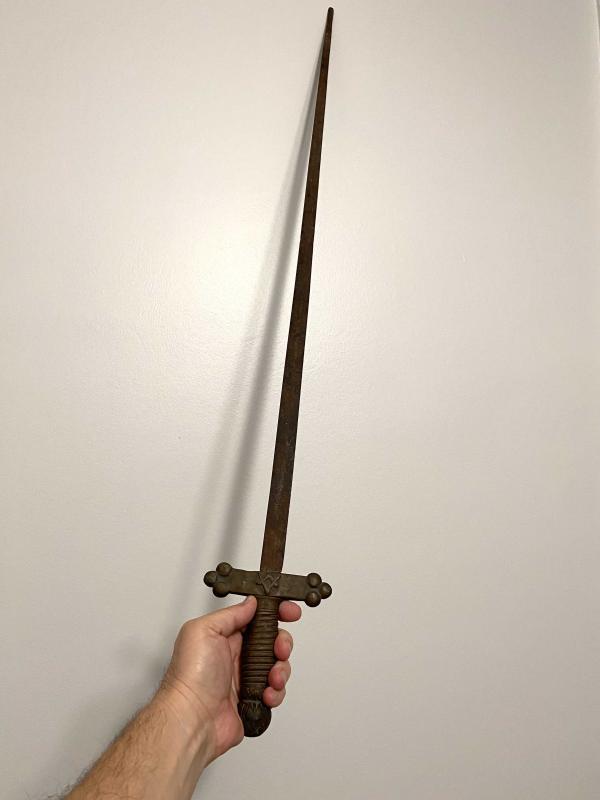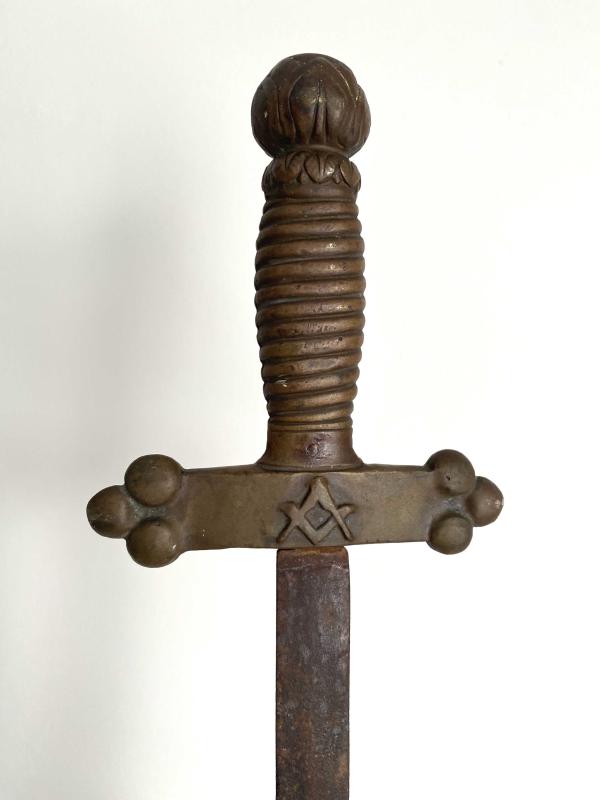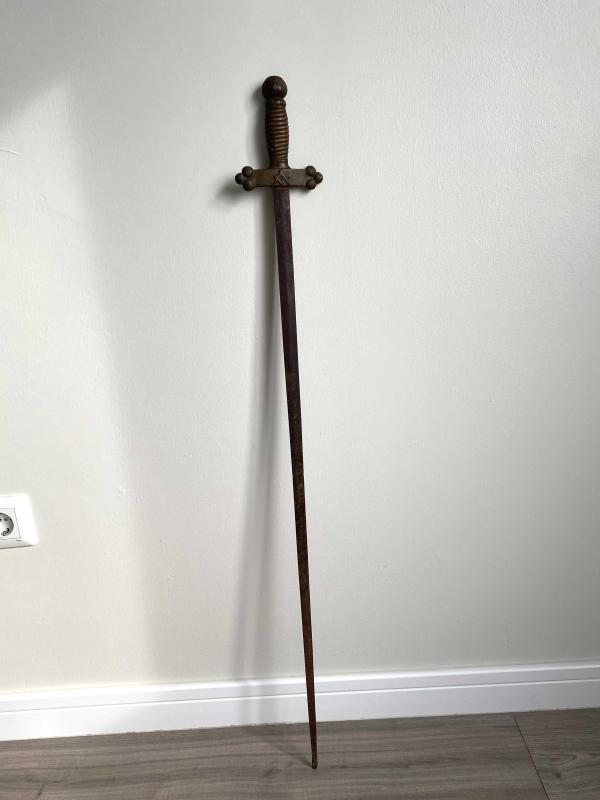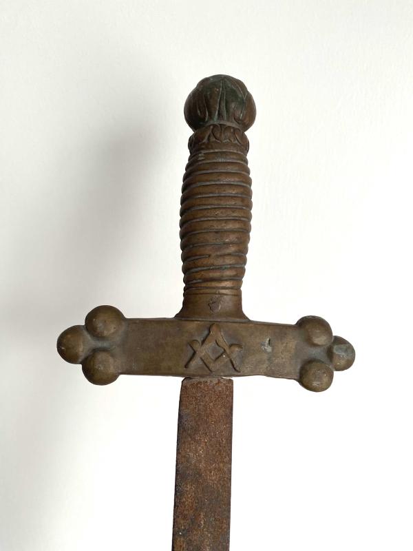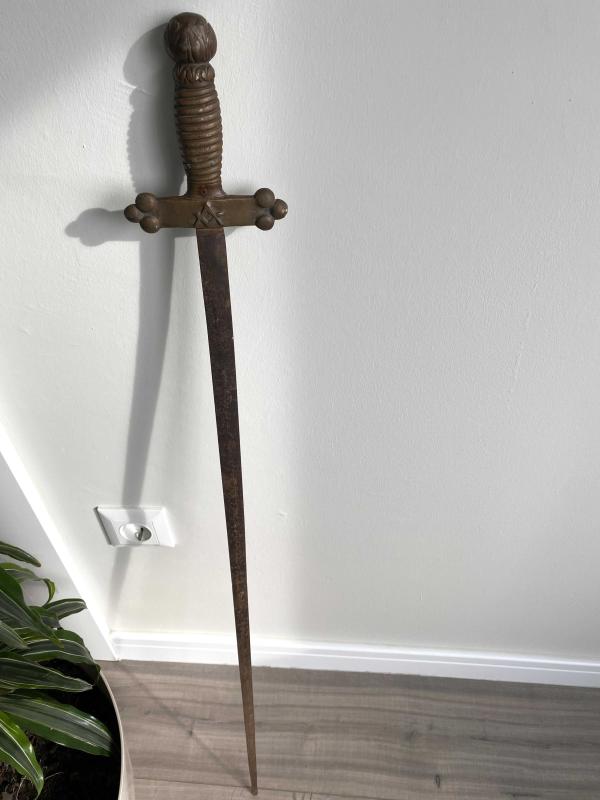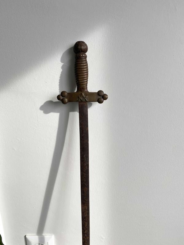 NADİR KOLEKSİYONLUK Masonik tören kılıcı. Asırlık mason tören kılıcı. Bronz döküm kabzalı. Kabza üzerinde mason sembolü bulunan koleksiyon değeri olan nadir bir eserdir. . 99 cm toplam boyu olan masonik tören kılıcı. .