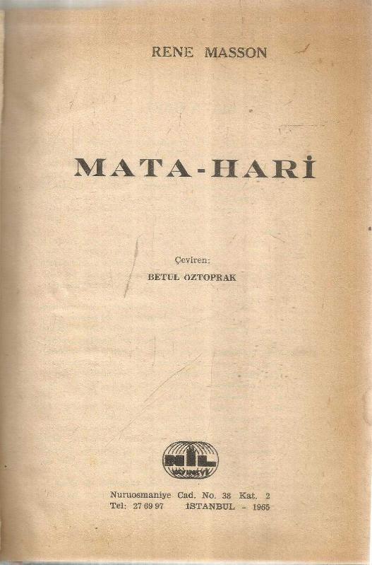 MATA HARI TARİHİN KAYDETTİĞİ EN BÜYÜK CASUS, RENE MASSON tarafından kaleme alınmıştır. Kitap 1965 yılında NİL YAYINEVİ tarafından [İSTANBUL] yayınlanmıştır. Bu baskının çevirisi BETUL ÖZTOPRAK tarafından yapılmıştır. 300 sayfadır. MATA HARI TARİHİN KAYDETTİĞİ EN BÜYÜK CASUS adlı eser Türkçe dilindedir.