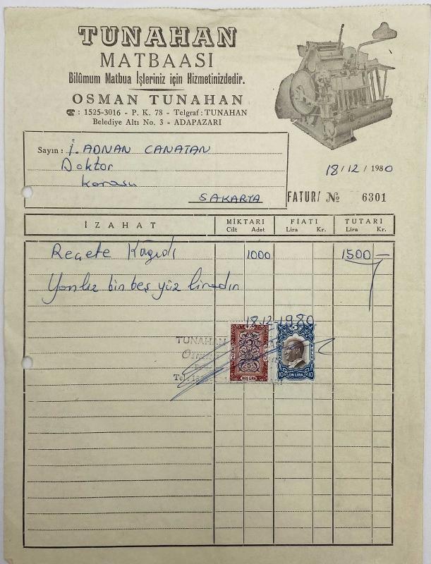 Tunahan Matbaası antetli Doktor İ. Adnan Canatan adına düzenlenmiş 1980 tarihli reçete kağıdı faturası. İki adet damga pulu ve matbaanın kaşesi mevcut 27 x 20 cm, delgeç delikli.