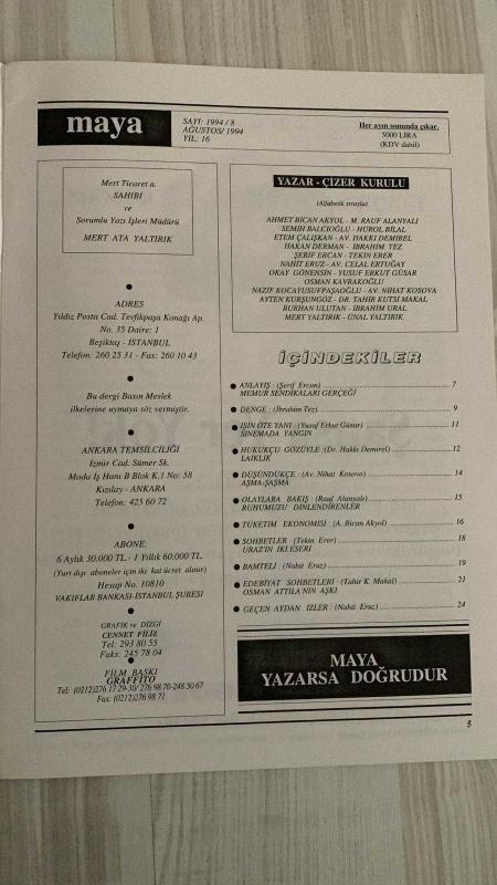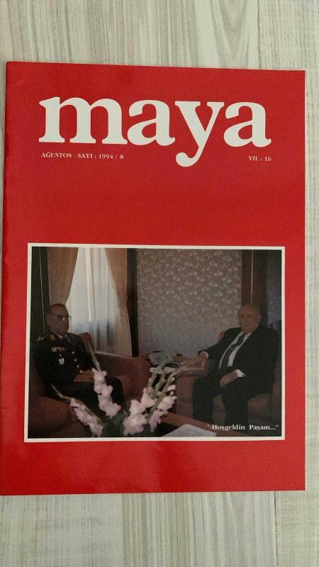 MAYA DERGİSİ – AĞUSTOS 1994 – SAYI 8 – YIL: 16 – 64 SAYFA KAPAK: “HOŞGELDİN PAŞAM...” – SİVİL VE ASKERİ YÜZLER BİR ARADA – GÖRSELDE TELEFON, ÇİÇEK, RESMİ DİYALOG – ŞERİF ERCAN’DAN “MEMUR SENDİKALARI GERÇEĞİ” – 1961 VE 1982 ANAYASALARI KARŞILAŞTIRMALI – SENDİKA KURMA HAKKI, GREV YASAĞI, SİYASİ ÜYELİKLER – YUSUF ERKUT GÜSAR’DAN “SİNEMADA YANGIN” – EKONOMİK KRİZLER VE TOPLUMSAL PSİKOLOJİ – BANKA PANİĞİ, MEDYA SORUMLULUĞU, 1929 NEW YORK ÖRNEĞİ – RAUF ALANYALI’DAN “RUHUMUZU DİNLENDİRENLER” – PROF. DR. NEVZAT ATLIĞ VE KLASİK TÜRK MÜZİĞİ KOROSU – BERLİN, BONN, MISIR, FAS, RUMELİHİSARI, SÜLEYMANİYE – AHMET BİCAN AKYOL’DAN “TÜKETİM EKONOMİSİ İNSANLIĞI TÜKETİYOR MU?” – KREDİ KARTI BAĞIMLILIĞI, MUTLULUK VE TÜKETİM – TEKİN ERER’DEN “URAZ’IN İKİ ESERİ” – “BABA” KİTABI, DEMİREL’İN SİYASİ YOLCULUĞU – TAHİR KUTSİ MAKAL’DAN “OSMAN ATTİLA’NIN AŞKI” – ŞİİR, DOSTLUK, İLHAM, “GÜPEGÜNDÜZ” VE “KÖYDEKİ YAVUKLU” – NAHİT ERUZ’DAN “BAMTELİ” – AYTEN KURŞUNGOZ’DAN “GEÇEN AYDAN İZLER” – SÜLEYMAN DEMİREL – ŞERİF ER, Ünal Yaltırık tarafından kaleme alınmıştır. Kitap Odak Matbaacılık tarafından yayınlanmıştır. 32 sayfadır. MAYA DERGİSİ – AĞUSTOS 1994 – SAYI 8 – YIL: 16 – 64 SAYFA KAPAK: “HOŞGELDİN PAŞAM...” – SİVİL VE ASKERİ YÜZLER BİR ARADA – GÖRSELDE TELEFON, ÇİÇEK, RESMİ DİYALOG – ŞERİF ERCAN’DAN “MEMUR SENDİKALARI GERÇEĞİ” – 1961 VE 1982 ANAYASALARI KARŞILAŞTIRMALI – SENDİKA KURMA HAKKI, GREV YASAĞI, SİYASİ ÜYELİKLER – YUSUF ERKUT GÜSAR’DAN “SİNEMADA YANGIN” – EKONOMİK KRİZLER VE TOPLUMSAL PSİKOLOJİ – BANKA PANİĞİ, MEDYA SORUMLULUĞU, 1929 NEW YORK ÖRNEĞİ – RAUF ALANYALI’DAN “RUHUMUZU DİNLENDİRENLER” – PROF. DR. NEVZAT ATLIĞ VE KLASİK TÜRK MÜZİĞİ KOROSU – BERLİN, BONN, MISIR, FAS, RUMELİHİSARI, SÜLEYMANİYE – AHMET BİCAN AKYOL’DAN “TÜKETİM EKONOMİSİ İNSANLIĞI TÜKETİYOR MU?” – KREDİ KARTI BAĞIMLILIĞI, MUTLULUK VE TÜKETİM – TEKİN ERER’DEN “URAZ’IN İKİ ESERİ” – “BABA” KİTABI, DEMİREL’İN SİYASİ YOLCULUĞU – TAHİR KUTSİ MAKAL’DAN “OSMAN ATTİLA’NIN AŞKI” – ŞİİR, DOSTLUK, İLHAM, “GÜPEGÜNDÜZ” VE “KÖYDEKİ YAVUKLU” – NAHİT ERUZ’DAN “BAMTELİ” – AYTEN KURŞUNGOZ’DAN “GEÇEN AYDAN İZLER” – SÜLEYMAN DEMİREL – ŞERİF ER adlı eser Türkçe dilindedir.