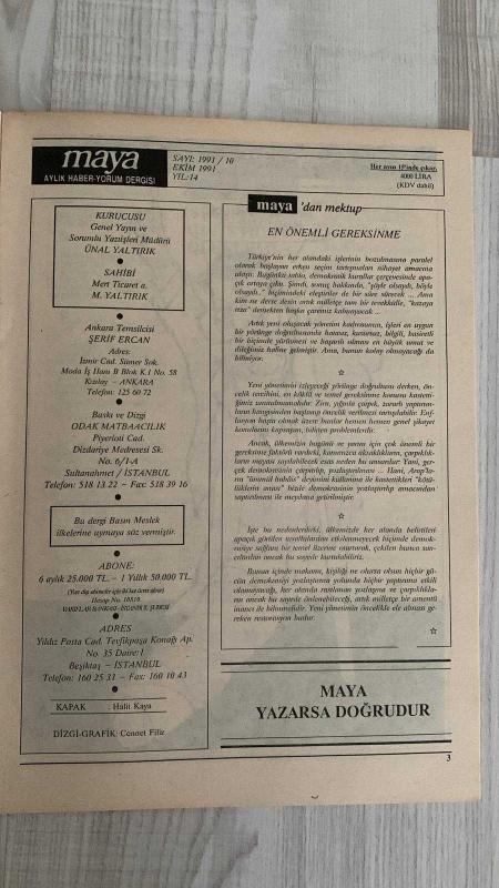 MAYA DERGİSİ – EKİM 1991 – SAYI 10 – YIL: 14 – 32 SAYFA EN BÜYÜK DEMİREL – ÖZAL’IN SONU GELDİ – DOĞAN AKIN’IN ANILARI – YENİ HÜKÜMETE SUÇ DUYURUSU – EN ÖNEMLİ GEREKSİNME: DÜRÜST VE YETKİN YÖNETİM – MAYA’DAN MEKTUP: DEMOKRASİYİ KURTARMAK İÇİN GÜVENİN TESİSİ – İSTANBUL’SUZ DA İKTİDAR OLUNURMUŞ – SEMİH BALCIOĞLU: “DAHA YAPACAK ÇOK İŞİMİZ VAR…” – SEÇİM 91: VE ÖZALGİLLER BİTTİ – DYP: 178, ANAP: 115, SHP: 88, RP: 62, DSP: 7 – PARTİLERİN DURUMU – PİR SULTAN ABDAL’DAN “MAYALAMA” – SEÇİM GÜNÜ DEMİREL’E BASIN İLGİSİ – GÜNCEL SİYASETTE YENİ DÖNEMİN İZLERİ SÜLEYMAN DEMİREL – TURGUT ÖZAL – DOĞAN AKIN – ÜNAL YALTIRIK – SEMİH BALCIOĞLU – HALİT KAYA – CENNET FİLİZ – ŞERİF ERCAN – MERT YALTRIK – PİR SULTAN ABDAL – MAYA YAYIN EKİBİ adlı eser, Kitap > Süreli Yayınlar > Dergiler > Siyaset kategorisinde İkinci El olarak satıştadır.