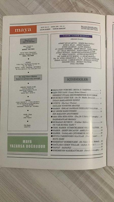 MAYA DERGİSİ –EKİM 1998 – SAYI 10 – YIL: 21 – 32 SAYFA -MAYA 21 YAŞINDA – SERBEST PİYASA EKONOMİSİNDE KONUŞMAK – İNSAN HAKLARININ İŞLEVİ – SAĞLAM YÖNETİM ARAYIŞI – EMLAKBANK ÖZELLEŞTİRİLİYOR – BİR BAKANIN ANATOMİSİ – BAŞBAKANLAR MASALI – NE VAR BUNDA YAHU? – GÜMRÜKLERDE NELER OLUYOR? – MATA HARİ – EDEBİYAT SOHBETLERİ – SANAT-SANATÇI – ESKİMEYEN KARİKATÜRLER - MERT ATA YALTIRIK – MURAT YALTIRIK – ÜNAL YALTIRIK – AHMET BİCAN AKYOL – SEMİH BALCIOĞLU – HÜROL BİLAL – AHMET BAŞSOY – ETEM ÇALIŞKAN – LATİF DEMİRCİ – AV. HAKKI DEMİREL – ŞERİF ERCAN – NAHİT ERUZ – AV. CELAL ERTUĞ – YUSUF ERKUT GÜSAR – AYHAN HÜNALP – NAZİF KOCAYUSUFPASAOĞLU – AV. NİHAT KOSOVA – AYTEN KURŞUNGÖZ – DR. TAHİR KUTSİ MAKAL – A. HİLMİ MARAŞLI – DOÇ. DR. SÜHA NİZAMOĞLU – PROF. C. TAYYAR SADIKLAR – İSMAİL SAVAŞ – CABBAR SÜLÜN – BURHAN ULUTAN – İBRAHİM URAL - adlı eser, Kitap > Süreli Yayınlar > Dergiler > Siyaset kategorisinde İkinci El olarak satıştadır.