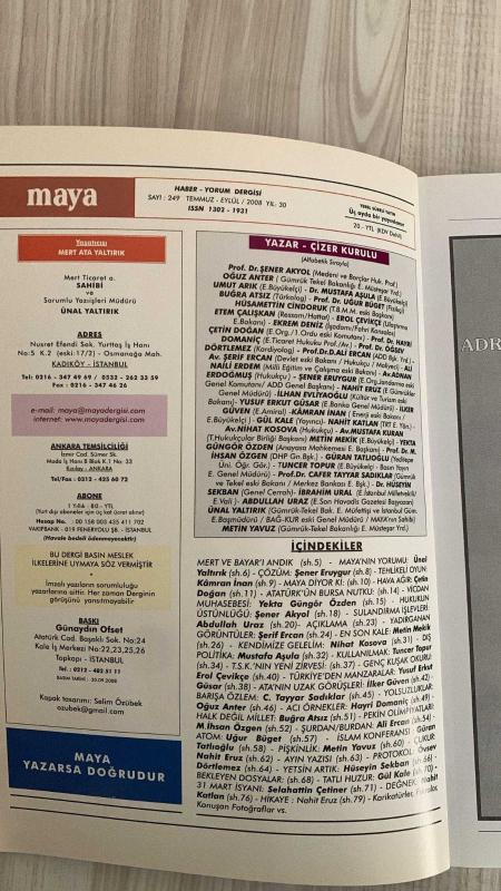 MAYA DERGİSİ - EYLÜL - 2008– SAYI 249 – 82 SAYFA - 30 YILDIR AYAKTA DURABİLEN TEK DERGİ - SÖZDE DEĞİL ÖZDE - SONUÇ - HUKUK DEVLETİ - HUKUKUN ÜSTÜNLÜĞÜ - ESKİMEYEN KARİKATÜRLER - MARKSİST DÖNEKLER - YENİ DEMOKRATLAR - ERGENEKON İDDİANAMESİ GEYİKLERİ - GİZLİ GÖRÜŞME - MAYA DİYOR Kİ - HAVA AĞIR - İLKER BAŞBUĞ - YAŞAR BÜYÜKANIT - TAYYİP ERDOĞAN - AYDIN DOĞAN - TURHAN SELÇUK - İHSAN GÖKTAŞ - AYHAN HANIM - MERT ATA YALTIRIK - ÜNAL YALTIRIK - SELİM ÖZÜBEK - ŞENER AKYOL - OĞUZ ANTER - UMUT ARIK - MUSTAFA AŞULA - BUĞRA ATSIZ - UĞUR BUGET - HÜSAMETTİN CINDORUK - ETEM ÇALIŞKAN - EROL ÇEVİKÇE - EKREM DENİZ - ÇETİN DOĞAN - HAYRİ DOMANİÇ - ÖĞSEV DÖRTLEMEZ - ALİ ERCAN - ŞERİF ERCAN - ALİ NAİLİ ERDEM - ADNAN ERDOĞMUŞ - ŞENER ERUYGUR - NAHİT ERUZ - İLHAN EVLİYAOĞLU - YUSUF ERKUT GUSAR - İLKER GÜVEN - KAMRAN İNAN - GÜL KALE - NAHİT KATLAN - NIHAT KOSOVA - MUSTAFA KURAN - METİN MEKİK - YEKTA GÜNGÖR ÖZDEN adlı eser, Kitap > Süreli Yayınlar > Dergiler > Siyaset kategorisinde İkinci El olarak satıştadır.