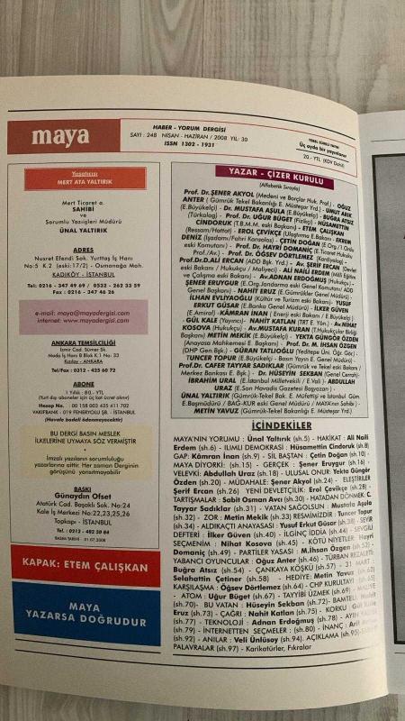 MAYA DERGİSİ - HAZİRAN - 2008– SAYI 248 – 98 SAYFA - MAYA’NIN YORUMU - HAKİKAT - ILIMLI DEMOKRASİ - GAP - SİL BAŞTAN - GERÇEK - VELEVKİ - ULUSAL ONUR - MÜDAHALE - ELEŞTİRİLER - YENİ DEVLETÇİLİK - TARTIŞMALAR - HATADAN DÖNMEK - VATAN SAĞOLSUN - ZOR - RESMİMİZDİR - ALDIKAÇTI ANAYASASI - SEYİR DEFTERİ - İLGİNÇ İDDİA - SEVGİLİ SEÇMENİM - KÖTÜ NİYETLER - PARTİLER YASASI - YABANCI OYUNCULAR - TÜRBAN REZALETİ - ÇANKAYA KÖŞKÜ - 31 MART - HEDİYE - KARŞILAŞMA - CHP KURULTAYI - ATOM - TAYYİBİ ÜZMEK - MALİYE - BU VATAN - BAMTELİ - ÇAĞRI - KORKU - TEKNOLOJİ - AYIN YAZISI - İNTERNETTEN SEÇMELER - İNANÇ - ANILAR - AÇIKLAMA - PALAVRALAR - MERT ATA YALTIRIK - ÜNAL YALTIRIK - ETEM ÇALIŞKAN - ŞENER AKYOL - OĞUZ ANTER - UMUT ARIK - MUSTAFA AŞULA - BUĞRA ATSIZ - UĞUR BUGET - HÜSAMETTİN CİNDORUK - EROL ÇEVİKÇE - EKREM DENİZ - ÇETİN DOĞAN - HAYRİ DOMANİÇ - ÖĞSEV DÖRTLEMEZ - ALİ ERCAN - ŞERİF ERCAN - ALİ NAİLİ ERDEM - ADNAN ERDOĞMUŞ - ŞENER ERUYGUR - NAHİT ERUZ - İLHAN EVLİYAOĞLU - YUSUF ERKUT GÜSAR - İLKE, Ünal Yaltırık tarafından kaleme alınmıştır. Kitap Odak Matbaacılık tarafından yayınlanmıştır. 98 sayfadır. MAYA DERGİSİ - HAZİRAN - 2008– SAYI 248 – 98 SAYFA - MAYA’NIN YORUMU - HAKİKAT - ILIMLI DEMOKRASİ - GAP - SİL BAŞTAN - GERÇEK - VELEVKİ - ULUSAL ONUR - MÜDAHALE - ELEŞTİRİLER - YENİ DEVLETÇİLİK - TARTIŞMALAR - HATADAN DÖNMEK - VATAN SAĞOLSUN - ZOR - RESMİMİZDİR - ALDIKAÇTI ANAYASASI - SEYİR DEFTERİ - İLGİNÇ İDDİA - SEVGİLİ SEÇMENİM - KÖTÜ NİYETLER - PARTİLER YASASI - YABANCI OYUNCULAR - TÜRBAN REZALETİ - ÇANKAYA KÖŞKÜ - 31 MART - HEDİYE - KARŞILAŞMA - CHP KURULTAYI - ATOM - TAYYİBİ ÜZMEK - MALİYE - BU VATAN - BAMTELİ - ÇAĞRI - KORKU - TEKNOLOJİ - AYIN YAZISI - İNTERNETTEN SEÇMELER - İNANÇ - ANILAR - AÇIKLAMA - PALAVRALAR - MERT ATA YALTIRIK - ÜNAL YALTIRIK - ETEM ÇALIŞKAN - ŞENER AKYOL - OĞUZ ANTER - UMUT ARIK - MUSTAFA AŞULA - BUĞRA ATSIZ - UĞUR BUGET - HÜSAMETTİN CİNDORUK - EROL ÇEVİKÇE - EKREM DENİZ - ÇETİN DOĞAN - HAYRİ DOMANİÇ - ÖĞSEV DÖRTLEMEZ - ALİ ERCAN - ŞERİF ERCAN - ALİ NAİLİ ERDEM - ADNAN ERDOĞMUŞ - ŞENER ERUYGUR - NAHİT ERUZ - İLHAN EVLİYAOĞLU - YUSUF ERKUT GÜSAR - İLKE adlı eser Türkçe dilindedir.
