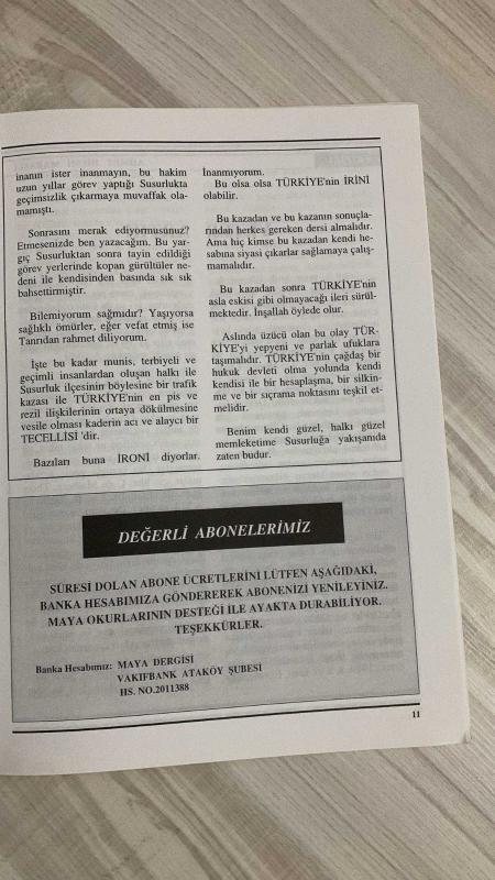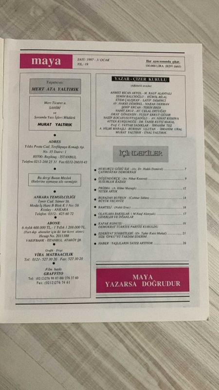 MAYA DERGİSİ –OCAK 1997 – SAYI 1 – YIL: 19 – 32 SAYFA - ÇATIRDAYAN DEMOKRASİ – SUSURLUK KAZASI – YETER ARTIK – BÜYÜK TECAVÜZ – LİDERLER VE İNSANLAR – DEMOKRAT TÜRKİYE PARTİSİ KURULDU – SIZE “ÖPKÜ”YÜ TAKDİM EDERİM – YAŞLILARIN SAYISI ARTIYOR - HÜSAMETTİN CİNDORUK – MERT ATA YALTIRIK – MURAT YALTIRIK – ÜNAL YALTIRIK – AV. DR. HAKKI DEMİREL – AV. NIHAT KOSOVA – A. HİLMİ MARAŞLI – CABBAR SÜLÜN – NAHİT ERUZ – M. RAUF ALANYALI – DR. TAHİR KUTSİ MAKAL, Ünal Yaltırık tarafından kaleme alınmıştır. Kitap Odak Matbaacılık tarafından yayınlanmıştır. 32 sayfadır. MAYA DERGİSİ –OCAK 1997 – SAYI 1 – YIL: 19 – 32 SAYFA - ÇATIRDAYAN DEMOKRASİ – SUSURLUK KAZASI – YETER ARTIK – BÜYÜK TECAVÜZ – LİDERLER VE İNSANLAR – DEMOKRAT TÜRKİYE PARTİSİ KURULDU – SIZE “ÖPKÜ”YÜ TAKDİM EDERİM – YAŞLILARIN SAYISI ARTIYOR - HÜSAMETTİN CİNDORUK – MERT ATA YALTIRIK – MURAT YALTIRIK – ÜNAL YALTIRIK – AV. DR. HAKKI DEMİREL – AV. NIHAT KOSOVA – A. HİLMİ MARAŞLI – CABBAR SÜLÜN – NAHİT ERUZ – M. RAUF ALANYALI – DR. TAHİR KUTSİ MAKAL adlı eser Türkçe dilindedir.