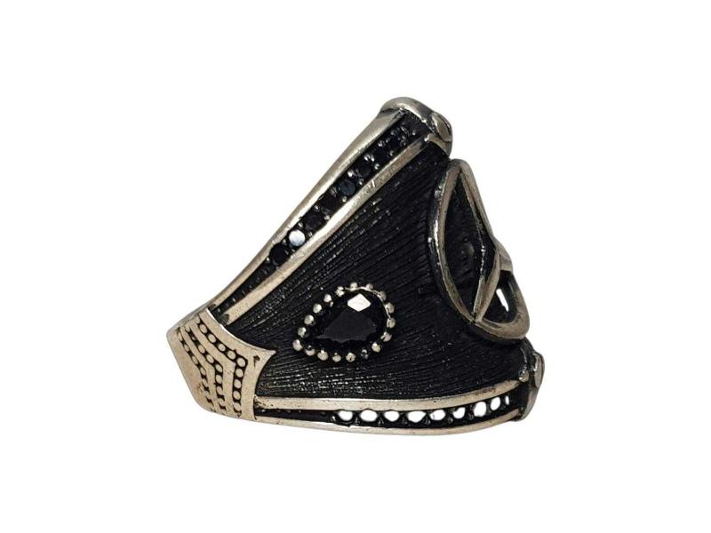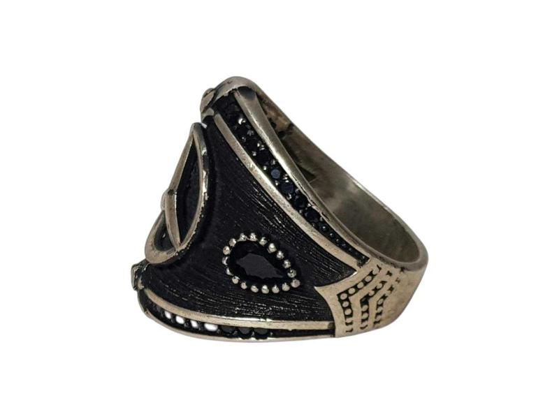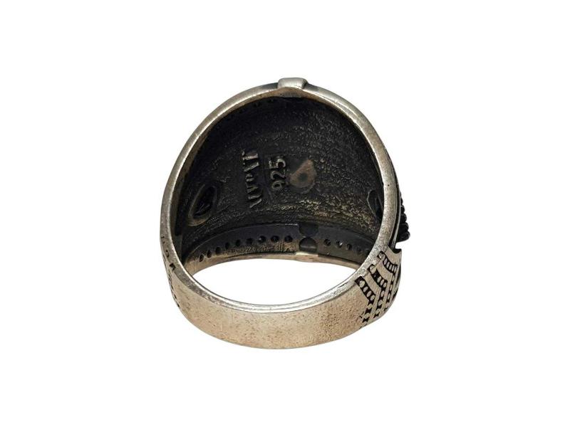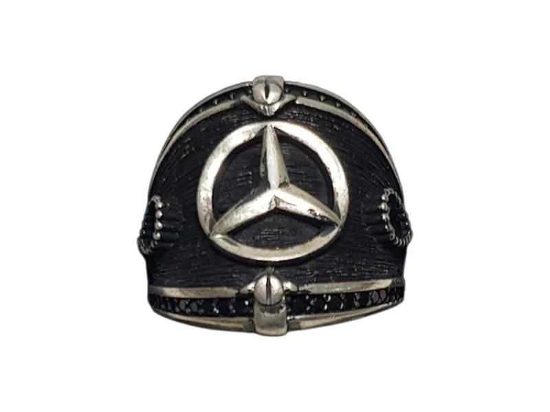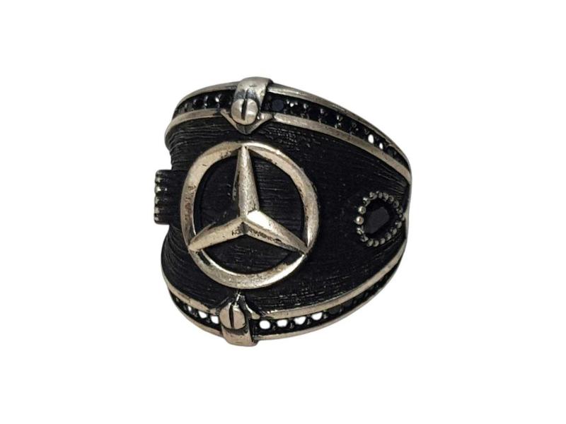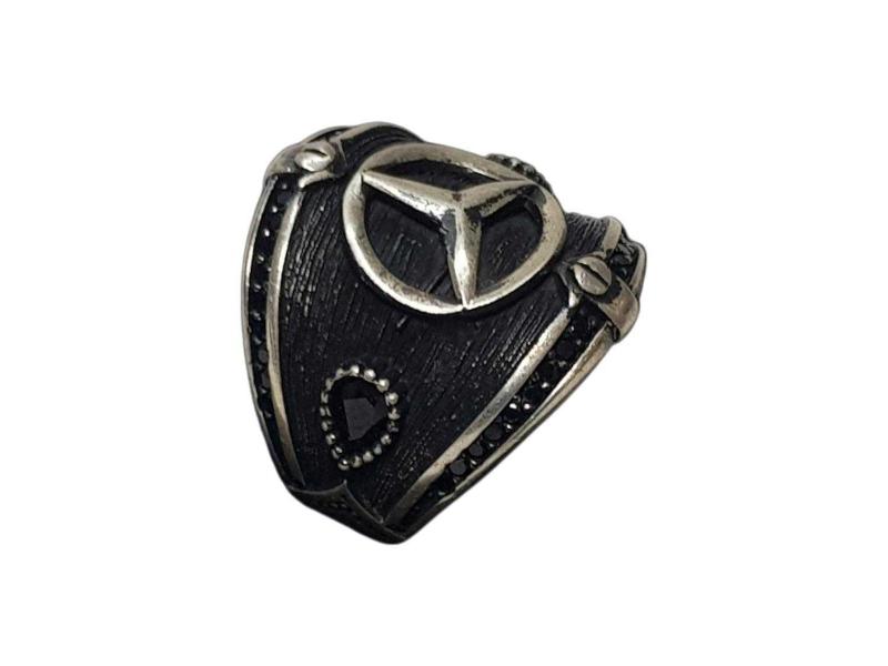 ÜZERİNDE MERCEDES AMBLEMİ VE SİYAH RENKLİ AKİK TAŞLAR BULUNAN HİÇ KULLANILMAMIŞ 925 AYAR GÜMÜŞ YÜZÜK. YÜZÜK NUMARASI: 23 AĞIRLIK: 9,2 GRAM