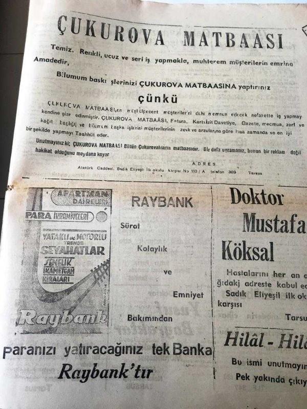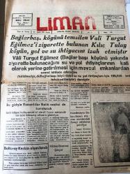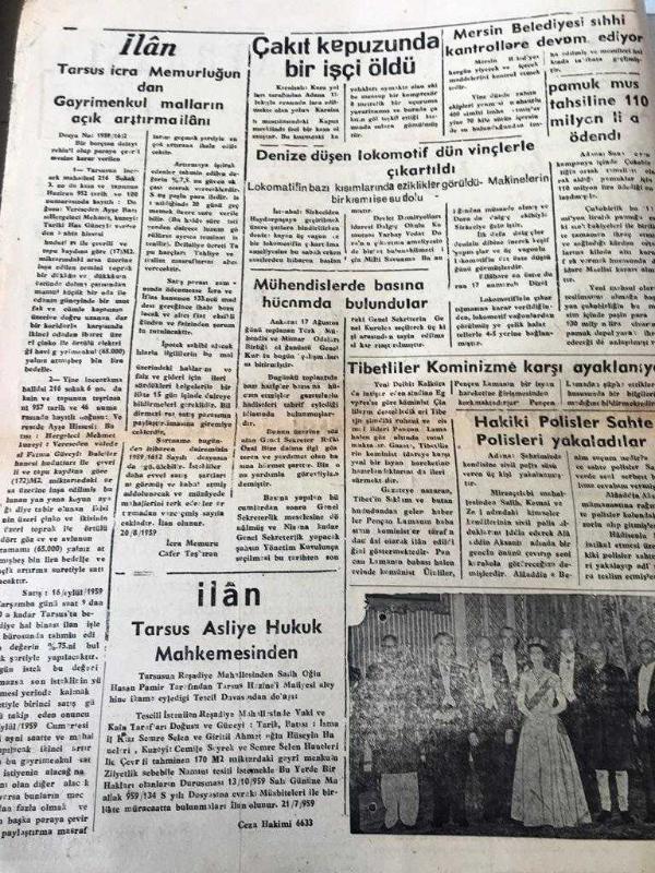 MERSİN LİMAN GAZETESİ YEREL TAŞRA BASINI ---21 Ağustos 1959 --Bağlarbaşı köyünü temsilen vali Turgut Eğilmez 'ı ziyarette bulunan Kılıç Tulay --Çakıt kapuzunda bir işçi öldü --Tibetliler Komünizme Karşı Ayaklanıyor --İlan Tarsus Asliye Hukuk Mahkemesinden ----Doktor :Mustafa Köksal --Doktor :Ömer Tavman - Doktor :Hayrı Altay --Doktor :Cemil Aybaş -- Yıpranma, sararmalar, kupon kesiği ve yırtılmalar zamana bağlı olarak görülebilir.