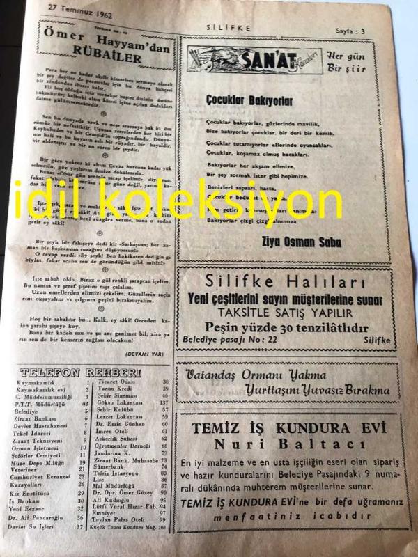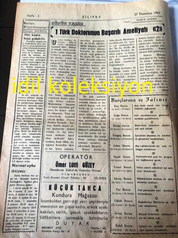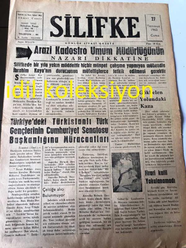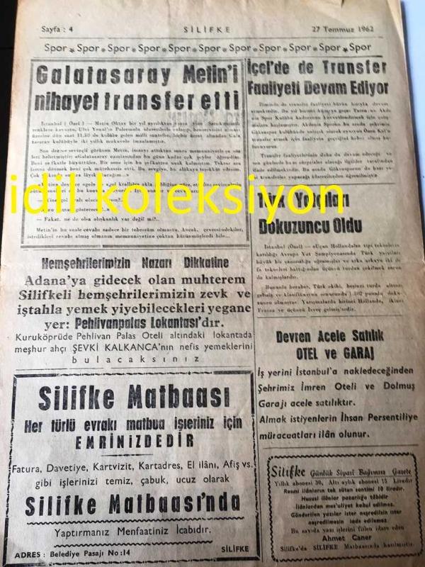MERSİN SİLİFKE GAZETESİ YEREL TAŞRA BASINI ---27 Temmuz 1962 Sayı :973--Arazi Kadastro Umum Müdürlüğünün Nazarı Dikkatine ---Türkiye de ki Türkistanlı Türk Gençlerinin Cumhuriyet Senatosu Başkanlığına Müracaatları --Bir Türk Doktorunun Başarılı Ameliyatı Yazan :Yusuf Ayhan ----OPERATÖR :Ömer Lütfi Güzey --Ömer Hayyam dan Rübailer ---Çocuklar Bakıyorlar :Ziya Osman Saba --Galatasaray Metin 'i Nihayet Transfer Etti --İçel de Transfer Faaliyeti Devam Ediyor --Türk Yatçıları Dokuzuncu Oldu -- Yıpranma, sararmalar, kupon kesiği ve yırtılmalar zamana bağlı olarak görülebilir.