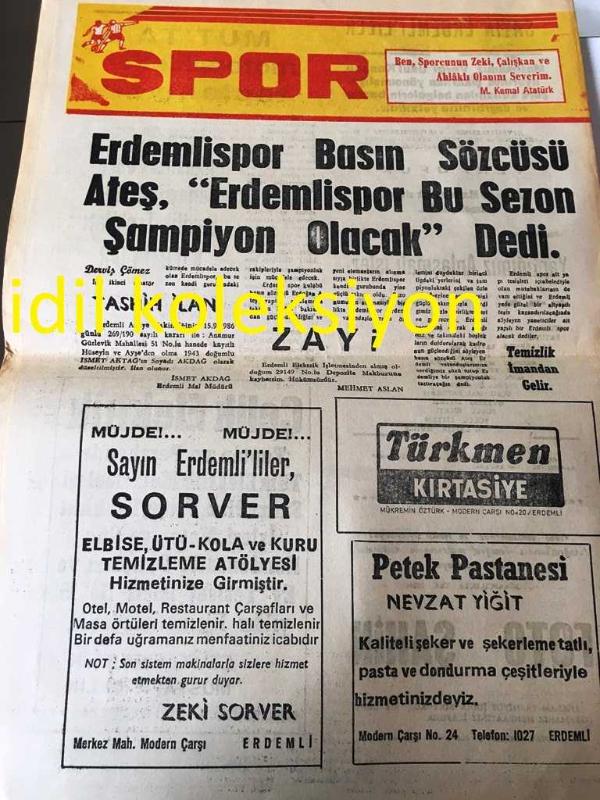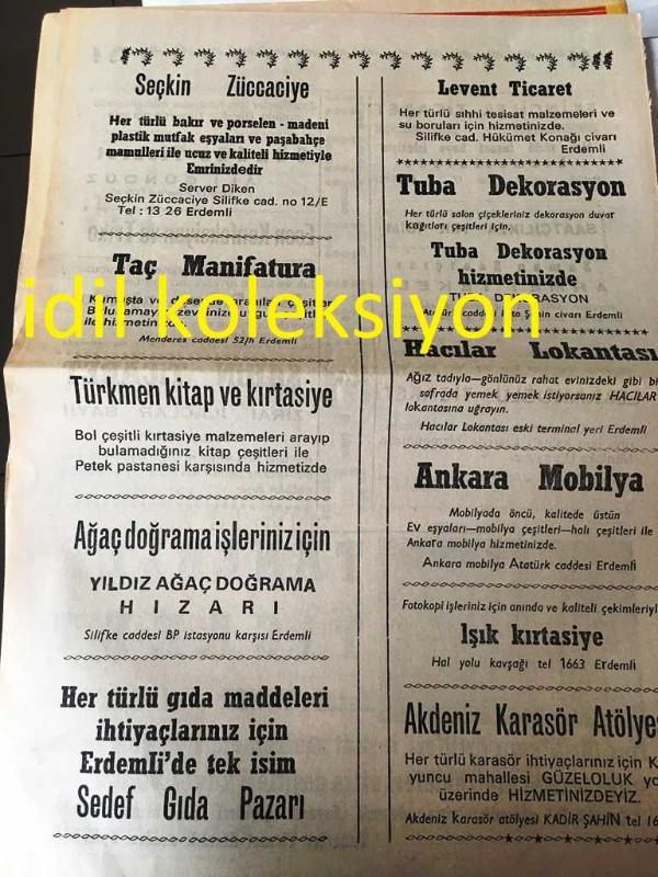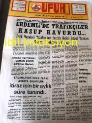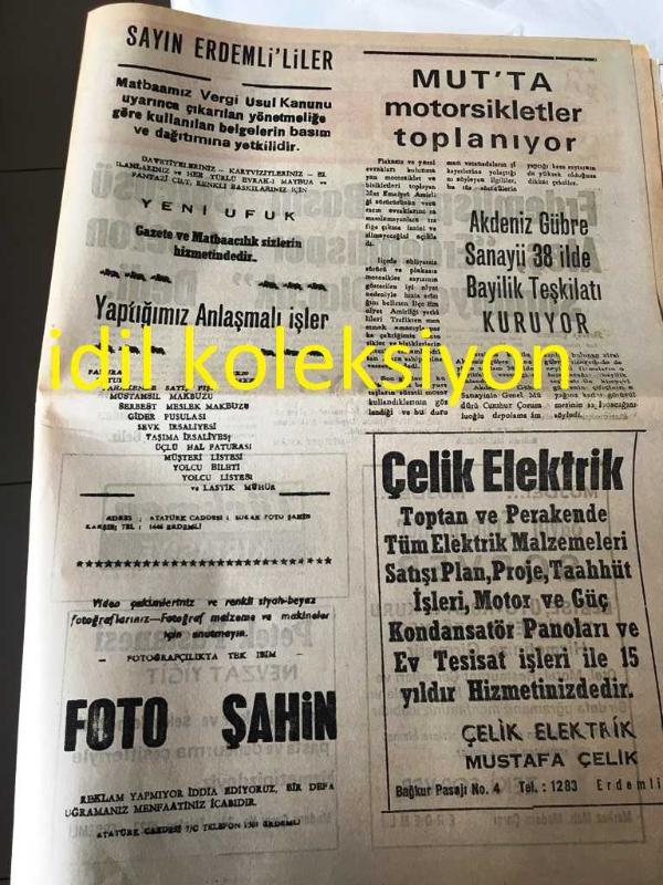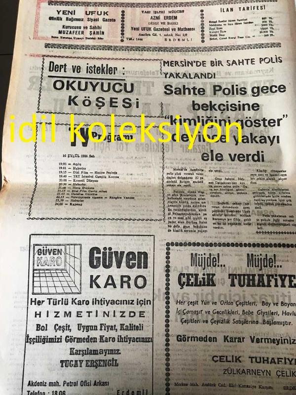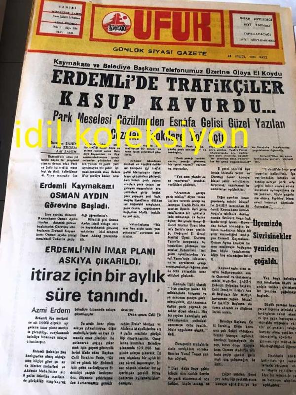 MERSİN YENİ UFUK GAZETESİ YEREL TAŞRA BASINI ---16 Eylül 1986 Yıl :1 Sayı :184--Kaymakam ve belediye başkanı telefonumuz üzerine olaya el koydu Erdemli de trafikçiler kasıp kavurdu --Erdemli Kaymakamı Osman Aydın Görevine Başladı --Mersin de bir sahte polis yakalandı - Mut 'ta motosikletler toplanıyor --Akdeniz Gübre Sanayi 38 İlde Bayilik Teşkilatı Kuruyor ---Erdemli spor Basın Sözcüsü Ateş Erdemli spor Bu Sezon Şampiyon Olacak Dedi Yıpranma, sararmalar, kupon kesiği ve yırtılmalar zamana bağlı olarak görülebilir.