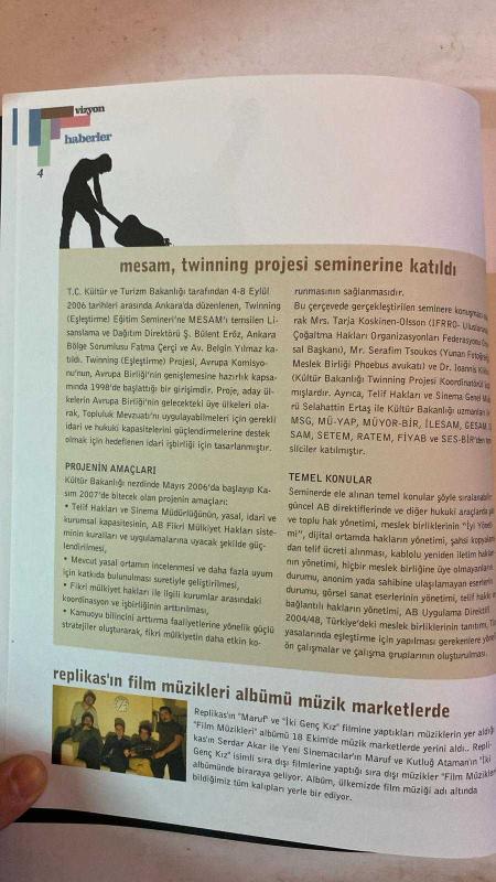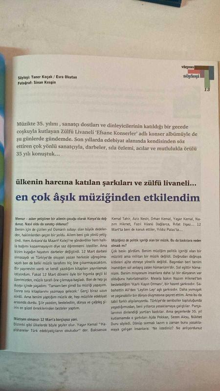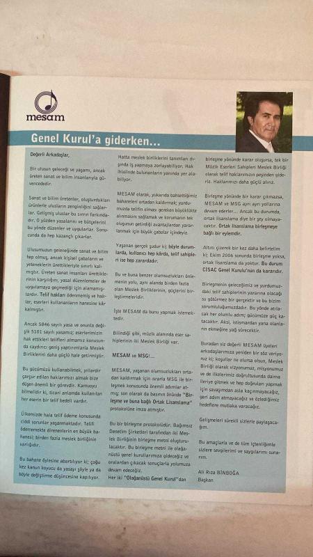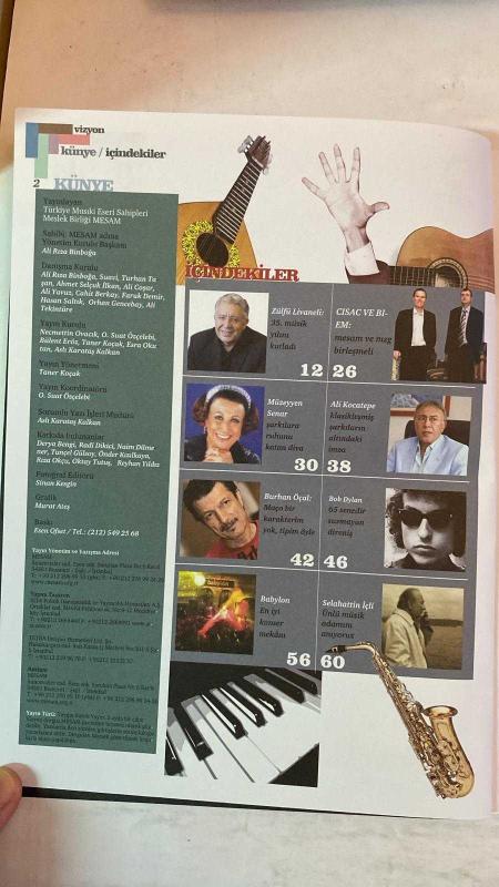 MESAM VİZYON, TÜRKİYE MUSİKİ ESERİ SAHİPLERİ MESLEK BİRLİĞİ DERGİSİ - EKİM KASIM 2006 SAYI: 02 ZÜLFÜ LİVANELİ - MÜZEYYEN SENAR - BURHAN ÖÇAL - ALİ KOCATEPE - NAİM DİLMENER - BOB DYLAN - SELAHATTİN İÇLİ - SIDİKA SU - ALİ ERKÖSE - MEHMET TALAT KURTER - HÜDADAT HANIM - DERYA BENGİ - RADI DİKİCİ - TUNÇEL GÜLSOY - ÖNDER KIZILKAYA - RIZA OKÇU - OKTAY TUTUŞ - REYHAN YILDIZ - GÖRGÜN TANER MÜZİK YILINDA ZÜLFÜ LİVANELİ - GÜNDEM: MESAM VE MSG GELECEĞE BAKMALI - USTAYA SAYGI: MÜZEYYEN SENAR - BURHAN ÖÇAL: MAÇO BİR KARAKTERİM - ALİ KOCATEPE İLE KLASİKLEŞMİŞ ŞARKILAR - NAİM DİLMENER'DEN POP TARİHİ - BOB DYLAN: SUSMAYAN DİRENİŞ - AKBANK CAZ FESTİVALİ - BABYLON: EN İYİ KONSER MEKÂNI - ARŞİVDEN: İLK POPSTAR HÜDADAT HANIM - BOĞAZİÇİ'NDE KLASİK MÜZİK - MESAM 2007 TARİFELERİ DUYURULDU - EN ÇOK TELİF ÖDEYEN ORGANİZASYONLAR - SIDİKA SU'YA VEDA - SELAHATTİN İÇLİ'Yİ ANIYORUZ - ARAMIZDAN AYRILANLAR - TAM TAKIM EKSİKSİZ 62 SAYFA, ALİ RIZA BİNBOĞA tarafından kaleme alınmıştır. Eser TANER KOÇAK editörlüğünde hazırlanmıştır. Kitap . tarafından yayınlanmıştır. 62 sayfadır. MESAM VİZYON, TÜRKİYE MUSİKİ ESERİ SAHİPLERİ MESLEK BİRLİĞİ DERGİSİ - EKİM KASIM 2006 SAYI: 02 ZÜLFÜ LİVANELİ - MÜZEYYEN SENAR - BURHAN ÖÇAL - ALİ KOCATEPE - NAİM DİLMENER - BOB DYLAN - SELAHATTİN İÇLİ - SIDİKA SU - ALİ ERKÖSE - MEHMET TALAT KURTER - HÜDADAT HANIM - DERYA BENGİ - RADI DİKİCİ - TUNÇEL GÜLSOY - ÖNDER KIZILKAYA - RIZA OKÇU - OKTAY TUTUŞ - REYHAN YILDIZ - GÖRGÜN TANER MÜZİK YILINDA ZÜLFÜ LİVANELİ - GÜNDEM: MESAM VE MSG GELECEĞE BAKMALI - USTAYA SAYGI: MÜZEYYEN SENAR - BURHAN ÖÇAL: MAÇO BİR KARAKTERİM - ALİ KOCATEPE İLE KLASİKLEŞMİŞ ŞARKILAR - NAİM DİLMENER'DEN POP TARİHİ - BOB DYLAN: SUSMAYAN DİRENİŞ - AKBANK CAZ FESTİVALİ - BABYLON: EN İYİ KONSER MEKÂNI - ARŞİVDEN: İLK POPSTAR HÜDADAT HANIM - BOĞAZİÇİ'NDE KLASİK MÜZİK - MESAM 2007 TARİFELERİ DUYURULDU - EN ÇOK TELİF ÖDEYEN ORGANİZASYONLAR - SIDİKA SU'YA VEDA - SELAHATTİN İÇLİ'Yİ ANIYORUZ - ARAMIZDAN AYRILANLAR - TAM TAKIM EKSİKSİZ 62 SAYFA adlı eser Türkçe dilindedir.