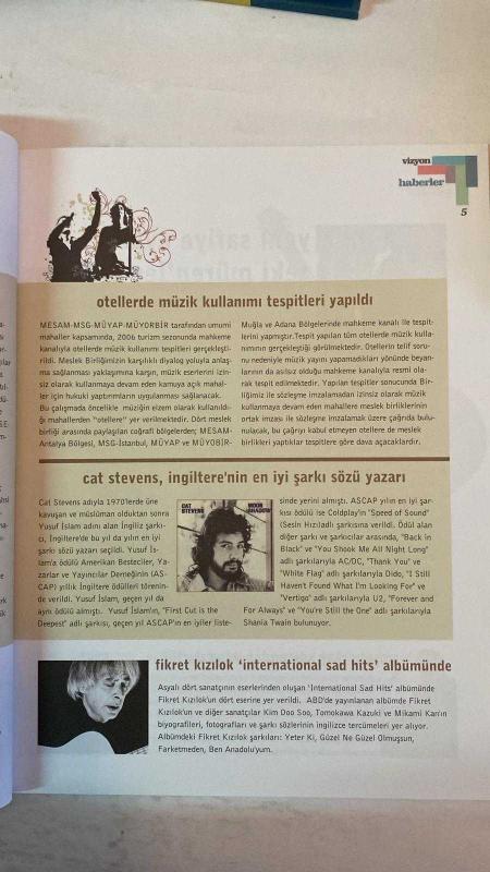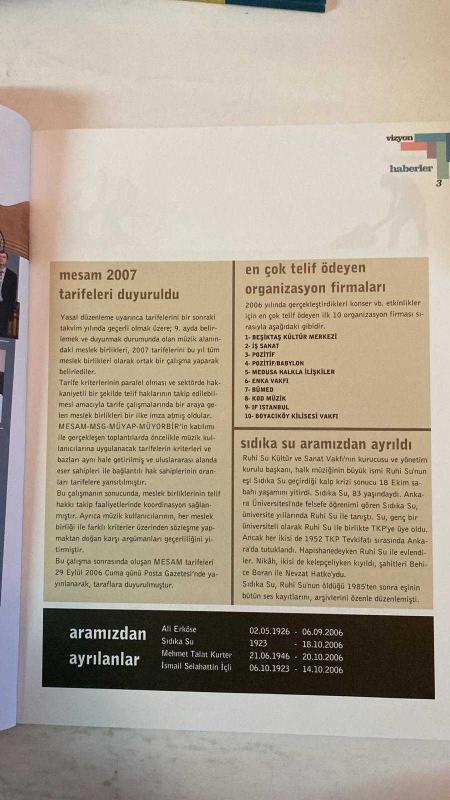 MESAM VİZYON, TÜRKİYE MUSİKİ ESERİ SAHİPLERİ MESLEK BİRLİĞİ DERGİSİ - EKİM KASIM 2006 SAYI: 02 ZÜLFÜ LİVANELİ - MÜZEYYEN SENAR - BURHAN ÖÇAL - ALİ KOCATEPE - NAİM DİLMENER - BOB DYLAN - SELAHATTİN İÇLİ - SIDİKA SU - ALİ ERKÖSE - MEHMET TALAT KURTER - HÜDADAT HANIM - DERYA BENGİ - RADI DİKİCİ - TUNÇEL GÜLSOY - ÖNDER KIZILKAYA - RIZA OKÇU - OKTAY TUTUŞ - REYHAN YILDIZ - GÖRGÜN TANER MÜZİK YILINDA ZÜLFÜ LİVANELİ - GÜNDEM: MESAM VE MSG GELECEĞE BAKMALI - USTAYA SAYGI: MÜZEYYEN SENAR - BURHAN ÖÇAL: MAÇO BİR KARAKTERİM - ALİ KOCATEPE İLE KLASİKLEŞMİŞ ŞARKILAR - NAİM DİLMENER'DEN POP TARİHİ - BOB DYLAN: SUSMAYAN DİRENİŞ - AKBANK CAZ FESTİVALİ - BABYLON: EN İYİ KONSER MEKÂNI - ARŞİVDEN: İLK POPSTAR HÜDADAT HANIM - BOĞAZİÇİ'NDE KLASİK MÜZİK - MESAM 2007 TARİFELERİ DUYURULDU - EN ÇOK TELİF ÖDEYEN ORGANİZASYONLAR - SIDİKA SU'YA VEDA - SELAHATTİN İÇLİ'Yİ ANIYORUZ - ARAMIZDAN AYRILANLAR - TAM TAKIM EKSİKSİZ 62 SAYFA adlı eser, Kitap > Süreli Yayınlar > Dergiler > Magazin, Moda kategorisinde İkinci El olarak satıştadır.