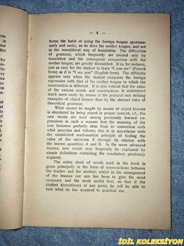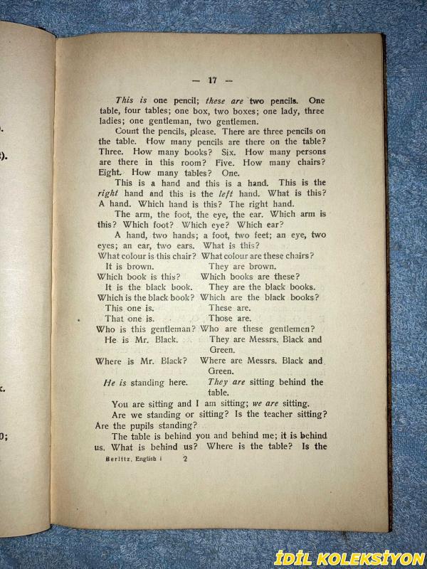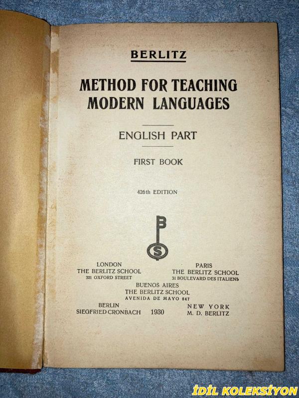METHOD FOR TEACHING MODERN LANGUAGES / ENGLISH PART / FIRST BOOK / M.D. BERLİTZ / THE BERLITZ SCHOOLS / İNGİLİZCE KİTAP (MODERN DİLLERİ ÖĞRETME YÖNTEMİ / İNGİLİZCE BÖLÜMÜ / BİRİNCİ KİTAP) HAFİF YIPRANMIŞ, M.D. BERLİTZ tarafından kaleme alınmıştır. Kitap 1930 yılında THE BERLITZ SCHOOLS tarafından [//] yayınlanmıştır. 11 sayfadır. METHOD FOR TEACHING MODERN LANGUAGES / ENGLISH PART / FIRST BOOK / M.D. BERLİTZ / THE BERLITZ SCHOOLS / İNGİLİZCE KİTAP (MODERN DİLLERİ ÖĞRETME YÖNTEMİ / İNGİLİZCE BÖLÜMÜ / BİRİNCİ KİTAP) HAFİF YIPRANMIŞ adlı eser İngilizce dilindedir.