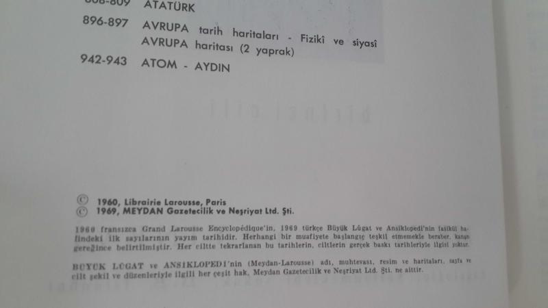 MEYDAN LAROUSSE Büyük Lügat ve Ansiklopedi .. 12 CİLT – Takım .. © MEYDAN Yayınevi - Librairie Larousse .. (ilk baskı / 1969-1973), Haz. SAFA KILIÇLIOĞLU -NEZİHE ARAZ -HAKKI DEVRİM tarafından kaleme alınmıştır. Eser SAFA KILIÇLIOĞLU -NEZİHE ARAZ -H.DEVRİM editörlüğünde hazırlanmıştır. Kitap 1969 yılında MEYDAN Yayınevi - Librairie Larousse tarafından [İstanbul] yayınlanmıştır. Satışta olan kitap, yayınevinin 1. baskısıdır. Bu baskının çevirisi Adnan Benk - Heyet tarafından yapılmıştır. 1 sayfadır. MEYDAN LAROUSSE Büyük Lügat ve Ansiklopedi .. 12 CİLT – Takım .. © MEYDAN Yayınevi - Librairie Larousse .. (ilk baskı / 1969-1973) adlı eser Türkçe dilindedir.