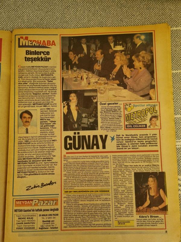 MEYDAN PAZAR GAZETESİ - 20 Aralık 1992 özel geceler Mustafa Oğuz Günay Muazzez Abacı Nükhet Duru Semra Tınaz - Kıbrıslı Bir Sen - yasak aşk hastanede bitti - Medyum Memiş İslam'da kadın hakları - Kenan Kaya Bu ne biçim Kabare - Ufuk büyükçelebi ne sabırlı insanlarız - moda kadınlara özel çizgiler - Zafer Dinçer yazıyor Serpil Çakmaklı anlatıyor 3 yıllık evliliğim kocam benim altımda ezildi - Müjde Ar uçuş eğitimi için Amerika'ya gidecekmiş - Harika Avcı yüzü eskiyor diye aynaya bakmıyormuş - sarı fırtına Kötü yolda Zafer Dinçer yazıyor - Biraz da mizah - Gülce Şeren yazıyor geçmişini geri verin İstanbul'a - Ceylan adlı eser Türkçe dilindedir.