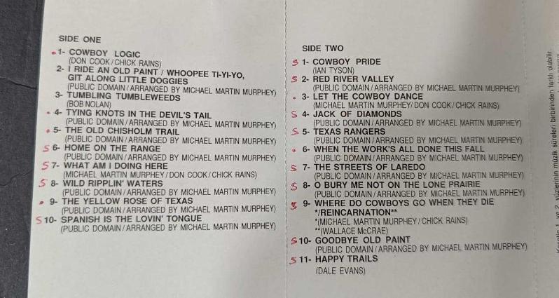 COUNTRY / FOLK 1990 BASKI MMY MÜZİK ESERLER: A1 Cowboy Logic A2 I Ride An Old Paint/Whoopee Ti-Yi-Yo, Git Along Little Doggies A3 Tumbling Tumbleweeds A4 Tying Knots In The Devil's Tail A5 The Old Chisholm Trail A6 Home On The Range A7 What Am I Doing Here A8 Wild Ripplin' Waters A9 The Yellow Rose Of Texas A10 Spanish Is The Lovin' Tongue B1 Cowboy Pride B2 Red River Valley B3 Let The Cowboy Dance B4 Jack Of Diamonds B5 Texas Rangers B6 When The Work's All Done This Fall B7 The Streets Of Laredo B8 O Bury Me Not On The Lone Prairie B9 Where Do Cowboys Go When They Die/Reincarnation B10 Goodbye Old Paint B11 Happy Trails 2.EL, TEMİZ ORİJİNAL VE BANDROLLÜ KARTONET İÇİNDEKİ ŞARKILARIN BAŞINA TÜKENMEZ KALEMLE İŞARET KONMUŞ GÖRSELDEKİ ÜRÜN