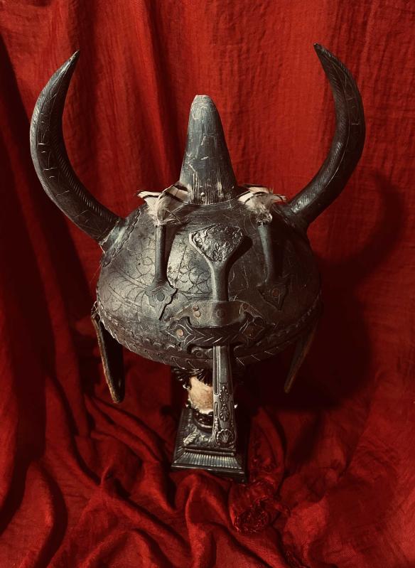 MİĞFER DETAYLI İŞÇİLİKLİ BOYNUZLU DERİLİ YAZILI ESKİ ÜRÜNDÜR başlıklı antika/koleksiyon objesi Türkiye menşe’lidir. Objenin ait olduğu dönem bilinmeketedir.