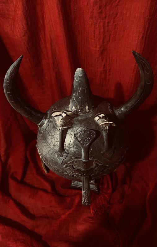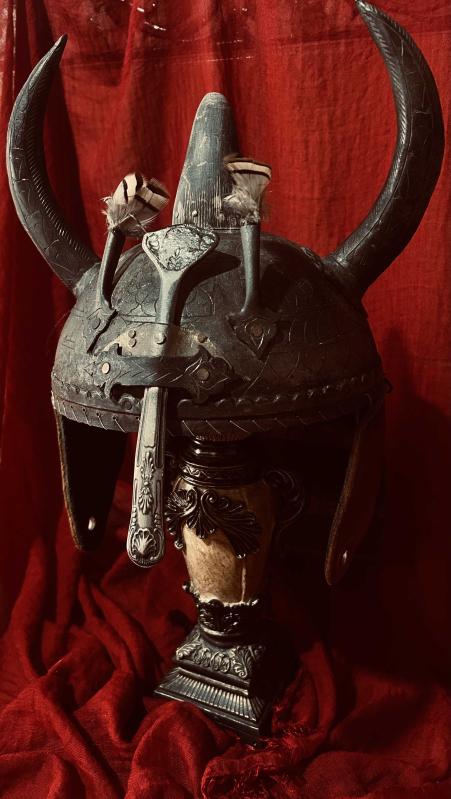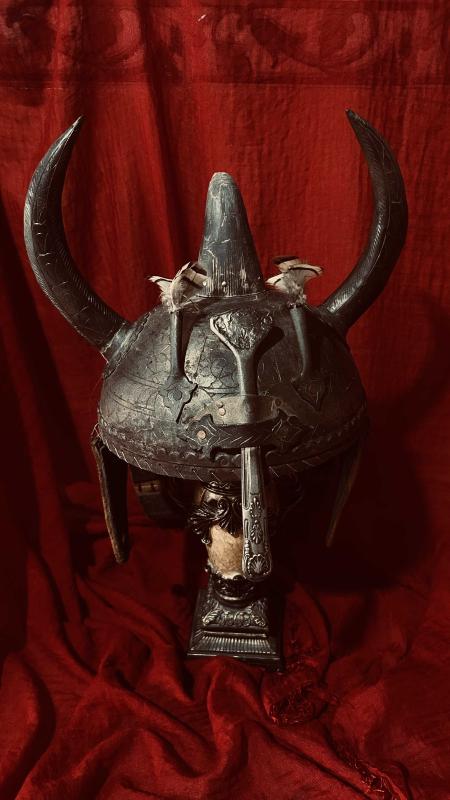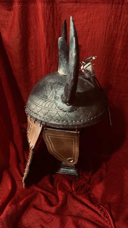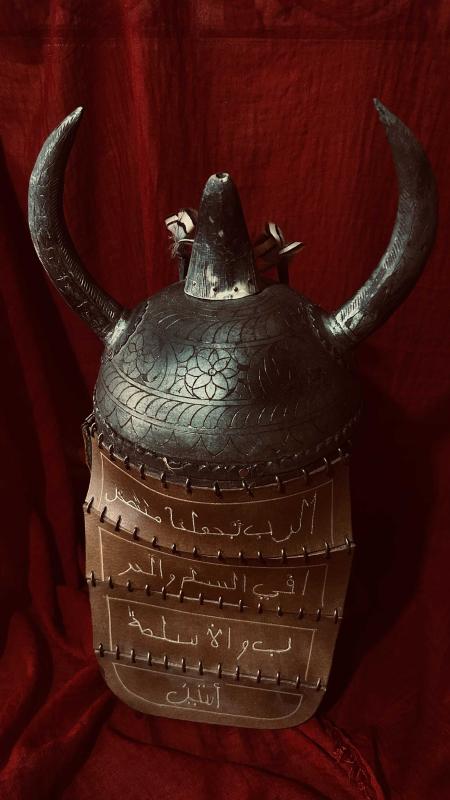 USTA İŞÇİLİKLİ ESKİ ÜRÜN BOYNUZLU DERİLİ YAZILI MİĞFER