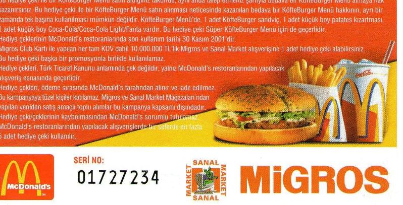MİGROS McDONALD'S ALIŞVERİŞ ÇEKLERİ (9) 2001.YILI .10.000.000A KADAR ALIŞVERİŞE 1 ÇEK ALMA ŞANSI, 3 yıl önce satışa sunulmuştur.