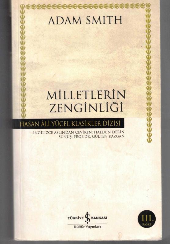 MİLLETLERİN ZENGİNLİĞİ - HASAN ALİ YÜCEL KLASİKLER DİZİSİ, ADAM SMITH tarafından kaleme alınmıştır. Eser SUNJUŞ: PROF.DR. GÜLTEN KAZGAN editörlüğünde hazırlanmıştır. Kitap 2009 yılında TÜRKİYE İŞ BANKASI KÜLTÜR YAYINLARI tarafından [İSTANBUL] yayınlanmıştır. Bu baskının çevirisi HALDUN DERİN tarafından yapılmıştır. 1.094 sayfadır. MİLLETLERİN ZENGİNLİĞİ - HASAN ALİ YÜCEL KLASİKLER DİZİSİ adlı eser Türkçe dilindedir.