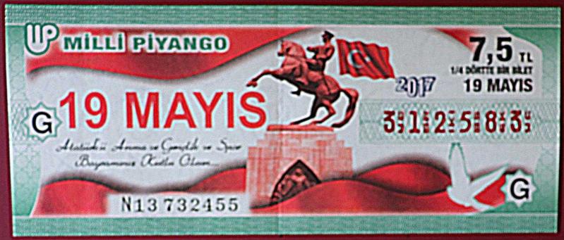 MİLLİ PİYANGO 19 MAYIS ATATÜRKÜ ANMA VE GENÇLİK VE SPOR BAYRAMI KUTLU OLSUN ÇEYREK BİLET (G) NOT KAT İZİ VAR, 4 gün önce satışa sunulmuştur.