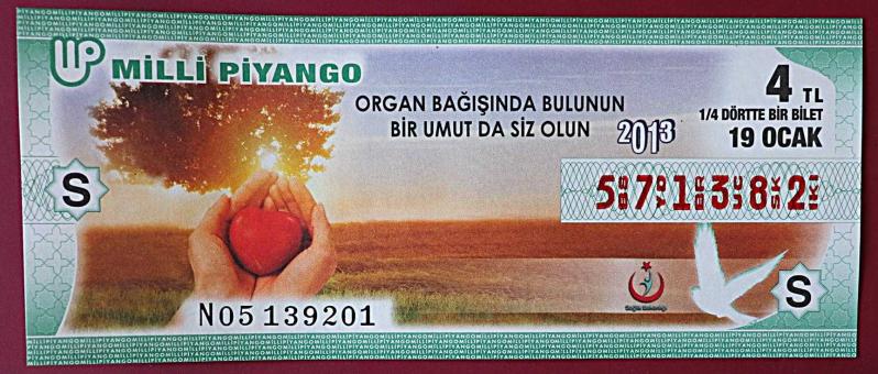 MİLLİ PİYANGO 19 OCAK 2013 ORGAN BAĞIŞINDA BULUNUN BİR UMUTTA SİZ OLUN ÇEYREK BİLET (S), 4 gün önce satışa sunulmuştur.