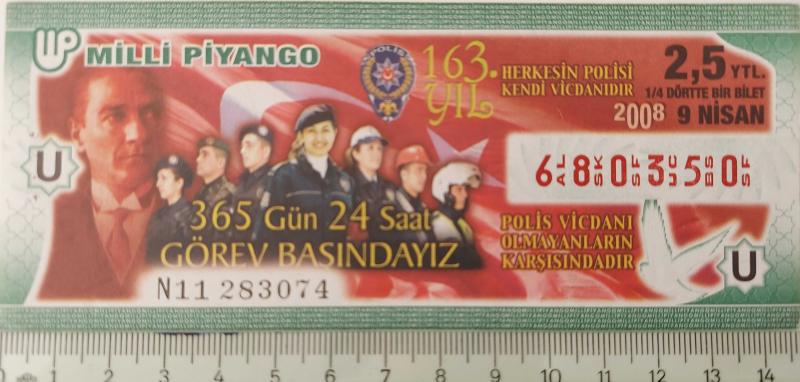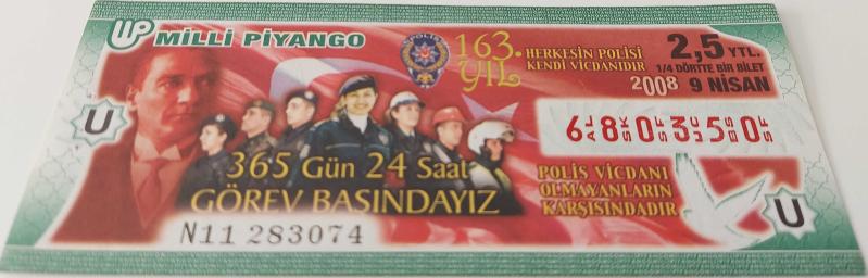 MİLLİ PİYANGO 9 NİSAN 2008 HERKESİN POLİSİ KENDİ VİCDANIDIR 163.YIL ANISINA U680350 NUMARALI 2,5 YENİ TÜRK LİRASI DÖRTTE BİR BİLET ÇOK ÇOK NADİR, en son bir ay önce güncellenmiştir.