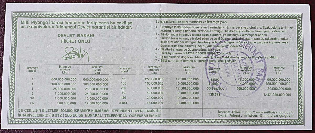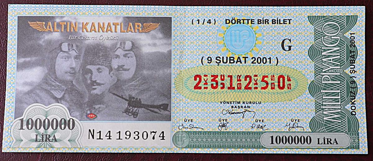 MİLLİ PİYANGO 9 ŞUBAT 2001 ALTIN KANATLAR ÇEYREK BİLET (G) NOT : KAT İZİ VAR, en son bir saat önce güncellenmiştir.