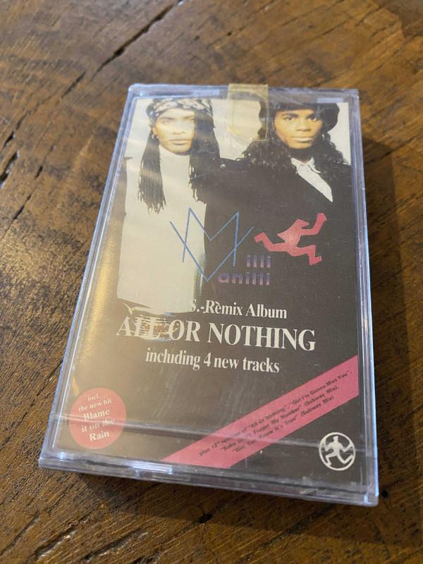 MILLI VANILLI - THE U.S. REMIX LBUM - ALL OR NOTHING - KASET 1989 - MMY A1 Blame It On The Rain (Super Club Mix - Long Version) 6:44 A2 More Than You'll Ever Know 3:52 A3 Take It As It Comes 4:12 A4 It's Your Thing 4:06 A5 Dreams To Remember (Remix) 4:51 B1 All Or Nothing (US Club Mix - Long Version) 4:31 B2 Baby Don't Forget My Number (N.Y. Subway Mix - Long Version) 4:53 B3 I'm Gonna Miss You (Remix - Long Version) 5:07 B4 Girl You Know It's True (N.Y.C. Subway Mix - Long Version) 6:28