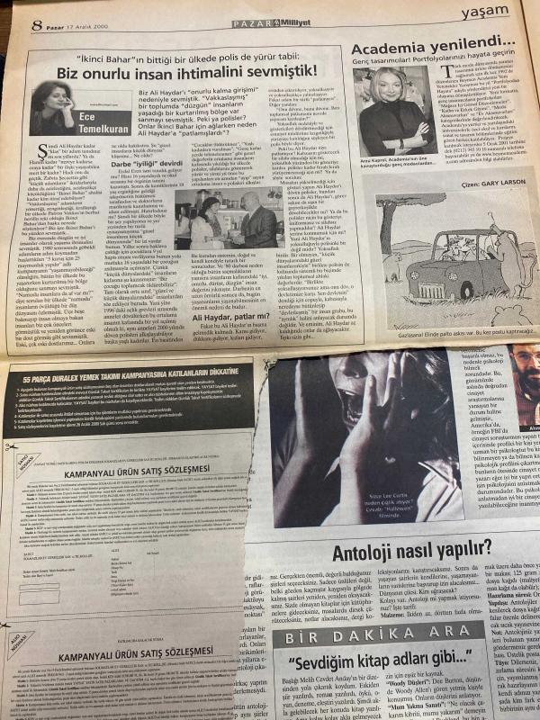 MİLLİYET GAZETESİ DOĞUM GÜNÜ HEDİYESİ - 17 ARALIK 2000 -TAM TAKIM 22 SAYFADIR -Çetin Altan-Kumru Sönmez-Gani Müjde-Ülkü Tamer-Ece Temelkuran-Yasemin Çongar-Mine G. Kırıkkanat-Ali Rıza Kardüz-Sina Koloğlu-Zeynep Oral-İlber Ortaylı-Fazıl Say-Richard Gere-Winona Ryder-Samuel L. Jackson-Keanu Reeves-James Spader-Marisa Tomei-Björk-Catherine Deneuve-Joshua Jackson-Paul Walker-Kenan Işık-Mehmet Ali Erbil-Cem Davran-Ayşegül Sönmez-Mine Tülek Kahvelerde şimdi iki tavla bir okey arası defile seyretmek moda-Kahve bahane manken şahane-Çetin Altan’ın İstanbul’u-Gençlik niye kaçıyor-Rüzgarı bildiği gibi-Yemekli sinemalar-Yüzyılın el izleri-Sarhoş olma hakkım olmadı-Mehmet Ali daha gerçek-Hamilelik danışmanı-Kapının arkasında ne var-Beni boğuyor Sesler Ziller Bizler-Hep Aşık Vardı-O Hep Güçlü-Korkusuz İtirazı Olan-The Watcher-Sen Hiç Ateş Böceği Gördün mü-Balalayka-Kırmızı Gezegen-Karanlıkta Dans-Saklı Seçilmişler-El Dorado-Bu Kış Öyküsü-Tavuklar Firarda, Ali Naci Karacan tarafından kaleme alınmıştır. MİLLİYET GAZETESİ DOĞUM GÜNÜ HEDİYESİ - 17 ARALIK 2000 -TAM TAKIM 22 SAYFADIR -Çetin Altan-Kumru Sönmez-Gani Müjde-Ülkü Tamer-Ece Temelkuran-Yasemin Çongar-Mine G. Kırıkkanat-Ali Rıza Kardüz-Sina Koloğlu-Zeynep Oral-İlber Ortaylı-Fazıl Say-Richard Gere-Winona Ryder-Samuel L. Jackson-Keanu Reeves-James Spader-Marisa Tomei-Björk-Catherine Deneuve-Joshua Jackson-Paul Walker-Kenan Işık-Mehmet Ali Erbil-Cem Davran-Ayşegül Sönmez-Mine Tülek Kahvelerde şimdi iki tavla bir okey arası defile seyretmek moda-Kahve bahane manken şahane-Çetin Altan’ın İstanbul’u-Gençlik niye kaçıyor-Rüzgarı bildiği gibi-Yemekli sinemalar-Yüzyılın el izleri-Sarhoş olma hakkım olmadı-Mehmet Ali daha gerçek-Hamilelik danışmanı-Kapının arkasında ne var-Beni boğuyor Sesler Ziller Bizler-Hep Aşık Vardı-O Hep Güçlü-Korkusuz İtirazı Olan-The Watcher-Sen Hiç Ateş Böceği Gördün mü-Balalayka-Kırmızı Gezegen-Karanlıkta Dans-Saklı Seçilmişler-El Dorado-Bu Kış Öyküsü-Tavuklar Firarda adlı eser Türkçe dilindedir.