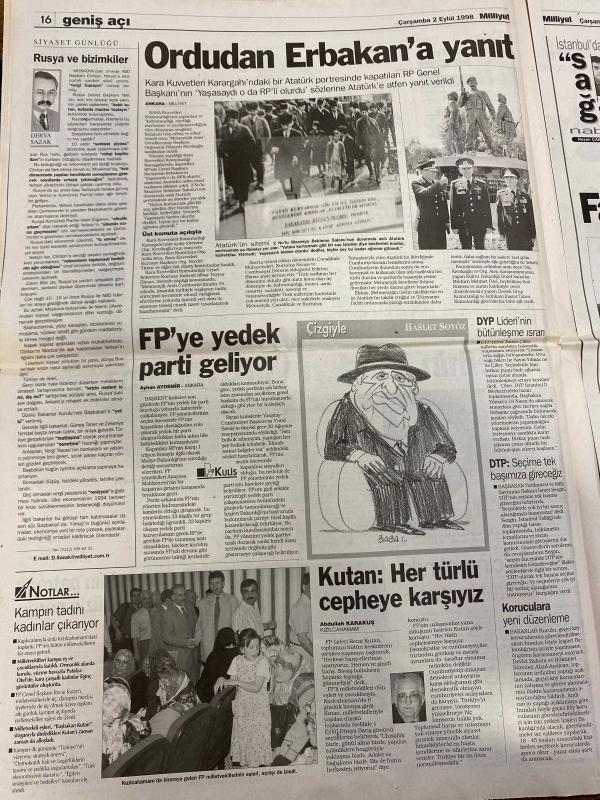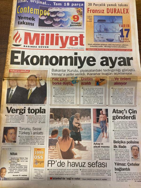 MİLLİYET GAZETESİ DOĞUM GÜNÜ HEDİYESİ - 2 EYLÜL 1998 - TAM TAKIM 36 SAYFADIR -Yeltsin-Veliat Sezai Türkeş-Hasan Yılmaz-Yavuz Donat-Aziz Yıldırım-Doğan Koloğlu-Attila Gökçe-Ulusoğlu-Tugay Kerimoğlu-Mustafa Denizli-Haluk Levent-Zülfü Livaneli-Yaşar Çakmak-Şeref Oğuz-Hakan Tokgöz-Önder Yılmaz-Hanım Gürek Ekonomiye ayar-Vergi topla-FP’de havuz sefası-Ataç’ı Çin gönderdi-Belçika polisine ilk ifade-Yılmaz çeteler bağlantılı-Rekabette dostluk olmaz-Denizli destek istedi-Cehennem Silahı 4-Melekler Şehri-Sihirli Kılıç-Başka Bir Dünya-Terörist-Cindy Sibel çok sempatik-Defilede pasta savaşı-İnat bitirdi-Rusya bile yaptı biz düşünüyoruz-Yılmaz vergide yeni indirimler açıklayacak-Derya Sazak-Haslet Soyöz-Ahmet Aydemir-Abdullah Karakuş-Ahmet Ünal Erkan-Numan Kurtulmuş-Serpil Çevikcan-Taha Akyol-Deniz Bölükbaşı-Cenk Başlamış-Bill Clinton-Boris Yeltsin-Fidel Castro-Güneri Cıvaoğlu Ordudan Erbakan’a yanıt-FP’ye yedek parti geliyor-Kutan her türlü cepheye karşıyız-Fazilet temkinli gidiyor-Fransa tipi Om, Ali Naci Karacan tarafından kaleme alınmıştır. MİLLİYET GAZETESİ DOĞUM GÜNÜ HEDİYESİ - 2 EYLÜL 1998 - TAM TAKIM 36 SAYFADIR -Yeltsin-Veliat Sezai Türkeş-Hasan Yılmaz-Yavuz Donat-Aziz Yıldırım-Doğan Koloğlu-Attila Gökçe-Ulusoğlu-Tugay Kerimoğlu-Mustafa Denizli-Haluk Levent-Zülfü Livaneli-Yaşar Çakmak-Şeref Oğuz-Hakan Tokgöz-Önder Yılmaz-Hanım Gürek Ekonomiye ayar-Vergi topla-FP’de havuz sefası-Ataç’ı Çin gönderdi-Belçika polisine ilk ifade-Yılmaz çeteler bağlantılı-Rekabette dostluk olmaz-Denizli destek istedi-Cehennem Silahı 4-Melekler Şehri-Sihirli Kılıç-Başka Bir Dünya-Terörist-Cindy Sibel çok sempatik-Defilede pasta savaşı-İnat bitirdi-Rusya bile yaptı biz düşünüyoruz-Yılmaz vergide yeni indirimler açıklayacak-Derya Sazak-Haslet Soyöz-Ahmet Aydemir-Abdullah Karakuş-Ahmet Ünal Erkan-Numan Kurtulmuş-Serpil Çevikcan-Taha Akyol-Deniz Bölükbaşı-Cenk Başlamış-Bill Clinton-Boris Yeltsin-Fidel Castro-Güneri Cıvaoğlu Ordudan Erbakan’a yanıt-FP’ye yedek parti geliyor-Kutan her türlü cepheye karşıyız-Fazilet temkinli gidiyor-Fransa tipi Om adlı eser Türkçe dilindedir.