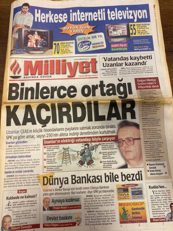 MİLLİYET GAZETESİ DOĞUM GÜNÜ HEDİYESİ - 2 TEMMUZ 2000 - TAM TAKIM 34 SAYFADIR -İnan Kıraç-Güneri Cıvaoğlu-Doğan Heper-Yalçın Doğan-Ergun Tata-Kartal Yiğit-Selim Soydan-Cengiz Mataracı-Vedat Günay-Mehmet Çiftçi-Oramiral Erdil-Özgür Cebe-Gökçer Tahincioğlu-Aziz Nesin-Ceyler Erşen-Boğulduk-Murat Gündüz-Fabien Barthez-Atilla Gökçe-Emre Belözoğlu-San Kırımlı-Nedved Ne Var Can-Binlerce ortağı kaçırdılar-Dünya Bankası bile bezdi-Vatandaş kaybetti Uzunlar kazandı-Avrupa’nın taç töreni-Yeni sezon yeni umut-Yeni sezona kurban keserek girdiler-Sahada konuşurum-Kartal fark attı-Jardel’i kaptırdık-Nouma imza attı-F.Bahçe hataydı-Türk kasırgası-Biz çok hain gördük-Karanfiller yanan canlara-32 çocuklu Hizbullahçı-7 yıl yargılama 33 idam-Melih Aşık-Dr. Bekir Ceylan-Yalçın Doğan-Nihat Altuntaş-Nuz Kuşdemir-Fikret Bila-Ahmet Tulgar-Ali Haydar Yurtsever-Nuri Ergin-Ekurt Yergüder-Muzaffer Yalçın-İsmail Polat-Vali Ayhan Çakır-Cennet Nar-Sezai Tüfekçi-Sezgin Ergin-Usta ve Çırak-Sevgi emektir-Temmuz hüzünle, Ali Naci Karacan tarafından kaleme alınmıştır. MİLLİYET GAZETESİ DOĞUM GÜNÜ HEDİYESİ - 2 TEMMUZ 2000 - TAM TAKIM 34 SAYFADIR -İnan Kıraç-Güneri Cıvaoğlu-Doğan Heper-Yalçın Doğan-Ergun Tata-Kartal Yiğit-Selim Soydan-Cengiz Mataracı-Vedat Günay-Mehmet Çiftçi-Oramiral Erdil-Özgür Cebe-Gökçer Tahincioğlu-Aziz Nesin-Ceyler Erşen-Boğulduk-Murat Gündüz-Fabien Barthez-Atilla Gökçe-Emre Belözoğlu-San Kırımlı-Nedved Ne Var Can-Binlerce ortağı kaçırdılar-Dünya Bankası bile bezdi-Vatandaş kaybetti Uzunlar kazandı-Avrupa’nın taç töreni-Yeni sezon yeni umut-Yeni sezona kurban keserek girdiler-Sahada konuşurum-Kartal fark attı-Jardel’i kaptırdık-Nouma imza attı-F.Bahçe hataydı-Türk kasırgası-Biz çok hain gördük-Karanfiller yanan canlara-32 çocuklu Hizbullahçı-7 yıl yargılama 33 idam-Melih Aşık-Dr. Bekir Ceylan-Yalçın Doğan-Nihat Altuntaş-Nuz Kuşdemir-Fikret Bila-Ahmet Tulgar-Ali Haydar Yurtsever-Nuri Ergin-Ekurt Yergüder-Muzaffer Yalçın-İsmail Polat-Vali Ayhan Çakır-Cennet Nar-Sezai Tüfekçi-Sezgin Ergin-Usta ve Çırak-Sevgi emektir-Temmuz hüzünle adlı eser Türkçe dilindedir.
