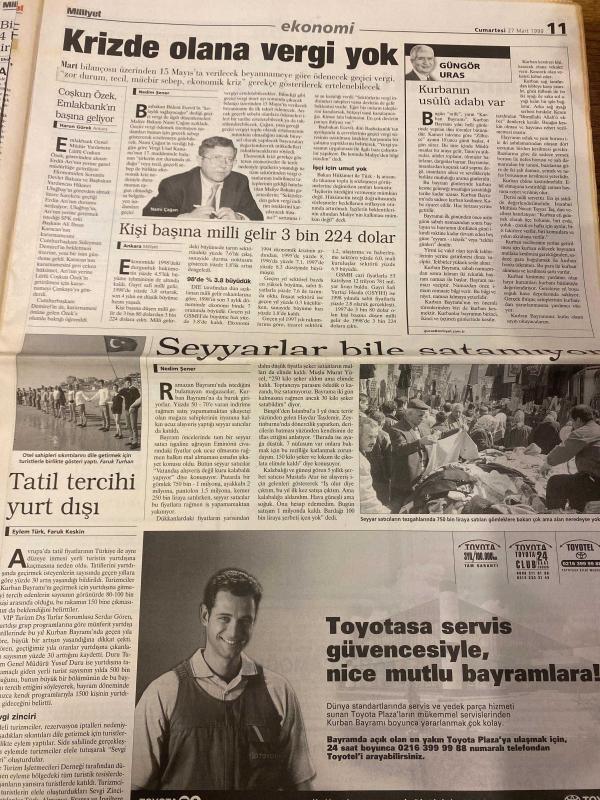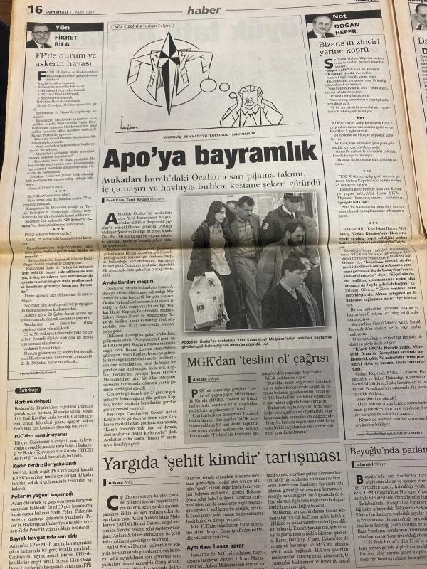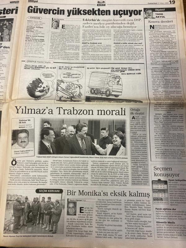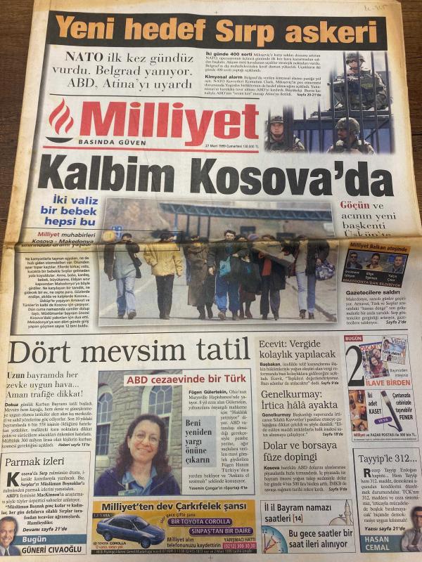 MİLLİYET GAZETESİ DOĞUM GÜNÜ HEDİYESİ - 27 MART 1999 - TAM TAKIM 34 SAYFADIR -Fügen Gülertekin-Güneri Cıvaoğlu-Mustafa Denizli-Bilal Meşe-Attila Gökçe-Ömer Üründül-Yaşar Saygı-Mesut Yavuz-Kemal Sunal-Metin Akpınar-Rafet El Roman-Meltem Cumbul-Sezen Aksu-John Carpenter-James Woods-Sandra Bullock-Nicole Kidman-Coşkun Özek-Nesrin Şener-Güngör Uras-Eylem Türk-Faruk Keskin-Fikret Bila-Doğan Heper-Turhan Selçuk-Tarık Aslan-Abdullah Öcalan-Hakan Tokgöz Yeni hedef Sırp askeri-Kalbim Kosova’da-Dört mevsim tatil-ABD cezaevinde bir Türk-Tek yol galibiyet-Ümitler bir harika-Sinaçetin Propaganda-Vampirler-Bir böceğin yaşamı-Aşkın büyüsü-Krizde olana vergi yok-Tatil tercihi yurt dışı-Apo’ya bayramlık-MGK’dan teslim ol çağrısı-Yargıda şehit kimdir tartışması-Derya Sazak-Arife Avcu-Tansu Çiller-Recai Kutan-Hikmet Sami Türk-Taha Akyol-Haslet Soyöz-Osman Yağmurdereli-Mesut Yılmaz-Eyüp Aşık-Berna Yılmaz-Nazım Alpman-Aziz Borutçina Erdoğan’dan son gösteri-Genelkurmay irtica hâlâ ayakta-Çiller gazetecileri, Ali Naci Karacan tarafından kaleme alınmıştır. MİLLİYET GAZETESİ DOĞUM GÜNÜ HEDİYESİ - 27 MART 1999 - TAM TAKIM 34 SAYFADIR -Fügen Gülertekin-Güneri Cıvaoğlu-Mustafa Denizli-Bilal Meşe-Attila Gökçe-Ömer Üründül-Yaşar Saygı-Mesut Yavuz-Kemal Sunal-Metin Akpınar-Rafet El Roman-Meltem Cumbul-Sezen Aksu-John Carpenter-James Woods-Sandra Bullock-Nicole Kidman-Coşkun Özek-Nesrin Şener-Güngör Uras-Eylem Türk-Faruk Keskin-Fikret Bila-Doğan Heper-Turhan Selçuk-Tarık Aslan-Abdullah Öcalan-Hakan Tokgöz Yeni hedef Sırp askeri-Kalbim Kosova’da-Dört mevsim tatil-ABD cezaevinde bir Türk-Tek yol galibiyet-Ümitler bir harika-Sinaçetin Propaganda-Vampirler-Bir böceğin yaşamı-Aşkın büyüsü-Krizde olana vergi yok-Tatil tercihi yurt dışı-Apo’ya bayramlık-MGK’dan teslim ol çağrısı-Yargıda şehit kimdir tartışması-Derya Sazak-Arife Avcu-Tansu Çiller-Recai Kutan-Hikmet Sami Türk-Taha Akyol-Haslet Soyöz-Osman Yağmurdereli-Mesut Yılmaz-Eyüp Aşık-Berna Yılmaz-Nazım Alpman-Aziz Borutçina Erdoğan’dan son gösteri-Genelkurmay irtica hâlâ ayakta-Çiller gazetecileri adlı eser Türkçe dilindedir.