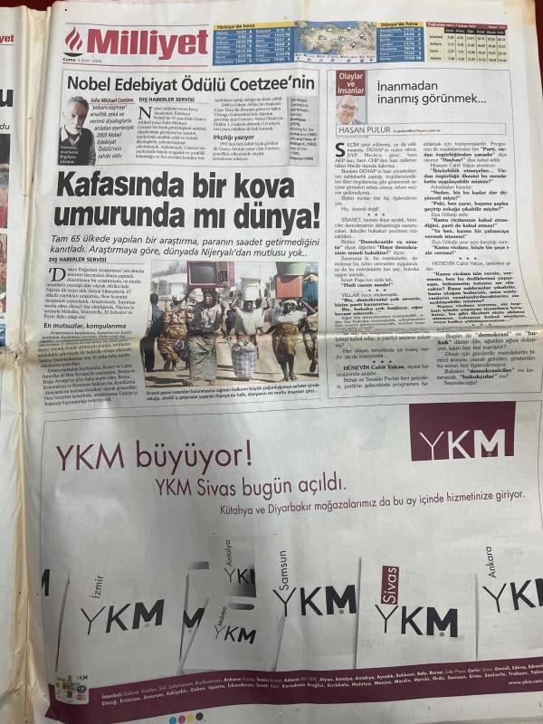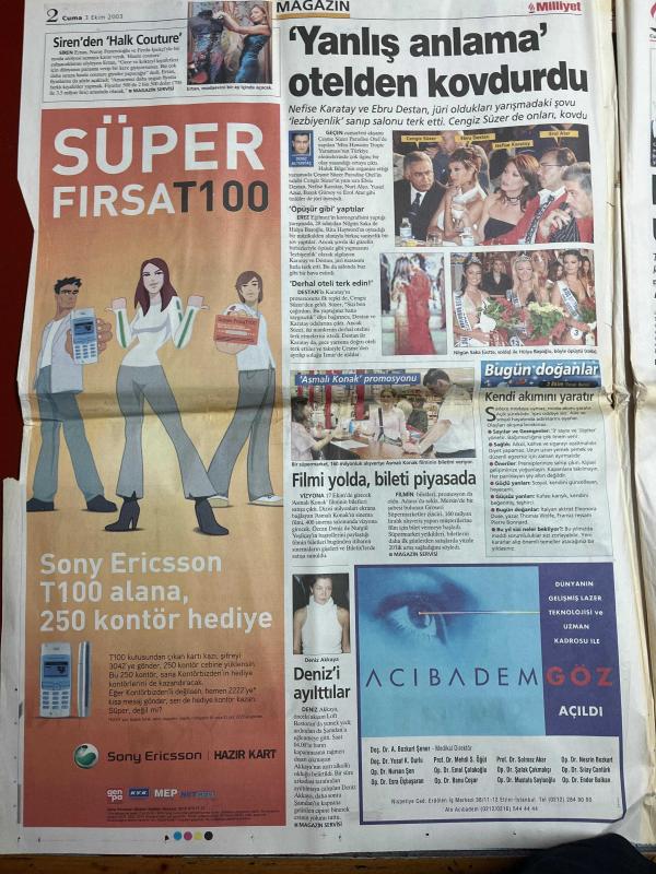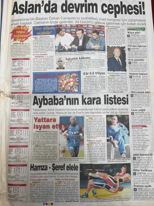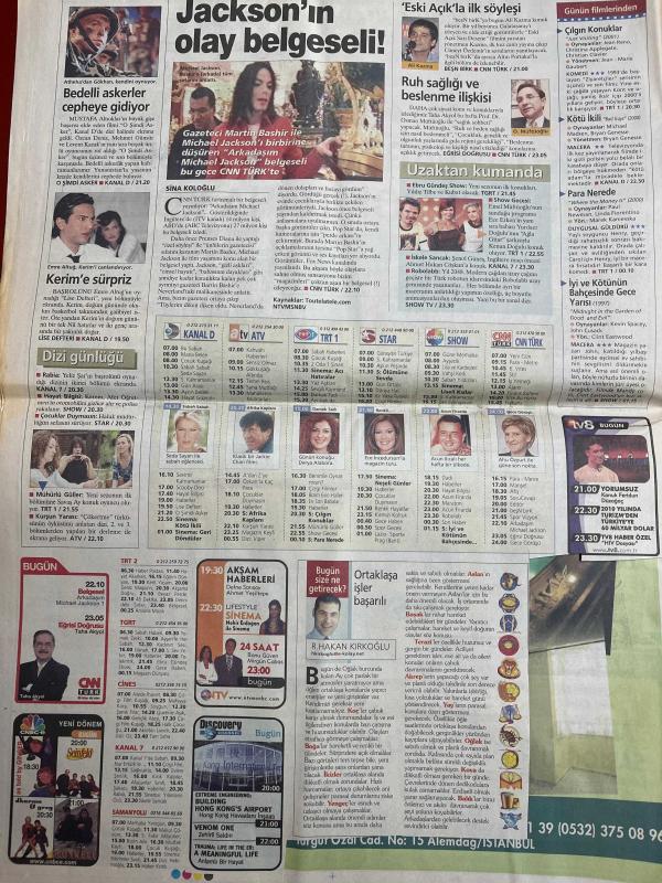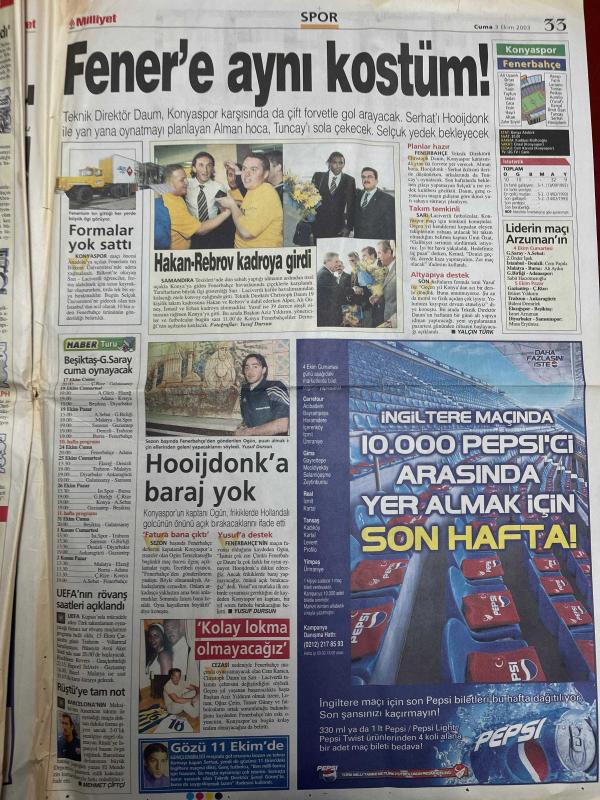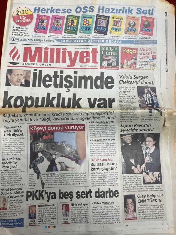MİLLİYET GAZETESİ DOĞUM GÜNÜ HEDİYESİ - 3 EKİM 2003 - TAM TAKIM 34 SAYFADIR -Recep Tayyip Erdoğan-Güneri Cıvaoğlu-Hasan Cemal-Michael Jackson-Sergen Yalçın-Şenol Güneş-Lucescu-Bilgin Gökberk-Orhan Yıldırım-Hakan Şükür-Ali Dürüst-Özhan Canaydın-Hamit Turhan-Hakan Şükür-Frank de Boer-Orhan Ak-Cihan Haspolatlı-Rebrov-Tuncay Şanlı-Daum-Yusuf Dursun-Oğün Temizkanoğlu-Ayhan Akman-Yattara-Van de Paar-Petkoviç-Metin Çeker-Mario Campos-Richard Burns-Carlos Sainz İletişimde kopukluk var-Köşeyi dönüp vuruyor-PKK’ya beş sert darbe-Fener’e aynı kostüm-Hakan-Rebrov kadroya girdi-Hooijdonk’a baraj yok-Sergen: Sahada isim değil cisim iş yapar-Lucescu frene bastı-İlhan Mansız’a 28 milyar ceza-Aslan’da devrim cephesi-Aybaba’nın kara listesi-Kollar erken sıvandı-Rallide hüzün-Gözler San Remo’da, Ali Naci Karacan tarafından kaleme alınmıştır. MİLLİYET GAZETESİ DOĞUM GÜNÜ HEDİYESİ - 3 EKİM 2003 - TAM TAKIM 34 SAYFADIR -Recep Tayyip Erdoğan-Güneri Cıvaoğlu-Hasan Cemal-Michael Jackson-Sergen Yalçın-Şenol Güneş-Lucescu-Bilgin Gökberk-Orhan Yıldırım-Hakan Şükür-Ali Dürüst-Özhan Canaydın-Hamit Turhan-Hakan Şükür-Frank de Boer-Orhan Ak-Cihan Haspolatlı-Rebrov-Tuncay Şanlı-Daum-Yusuf Dursun-Oğün Temizkanoğlu-Ayhan Akman-Yattara-Van de Paar-Petkoviç-Metin Çeker-Mario Campos-Richard Burns-Carlos Sainz İletişimde kopukluk var-Köşeyi dönüp vuruyor-PKK’ya beş sert darbe-Fener’e aynı kostüm-Hakan-Rebrov kadroya girdi-Hooijdonk’a baraj yok-Sergen: Sahada isim değil cisim iş yapar-Lucescu frene bastı-İlhan Mansız’a 28 milyar ceza-Aslan’da devrim cephesi-Aybaba’nın kara listesi-Kollar erken sıvandı-Rallide hüzün-Gözler San Remo’da adlı eser Türkçe dilindedir.