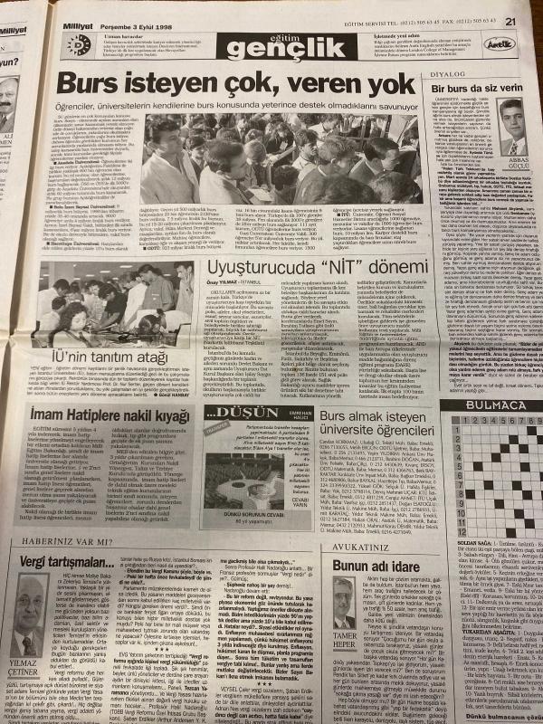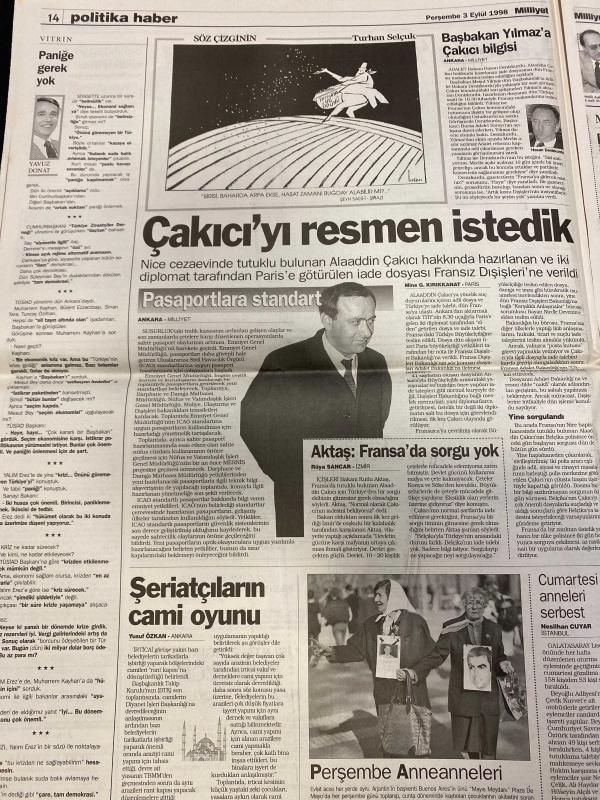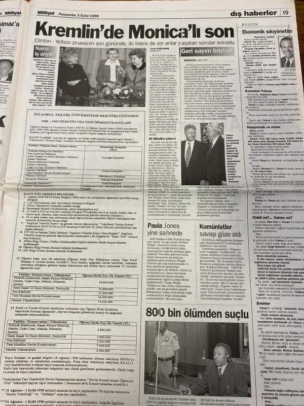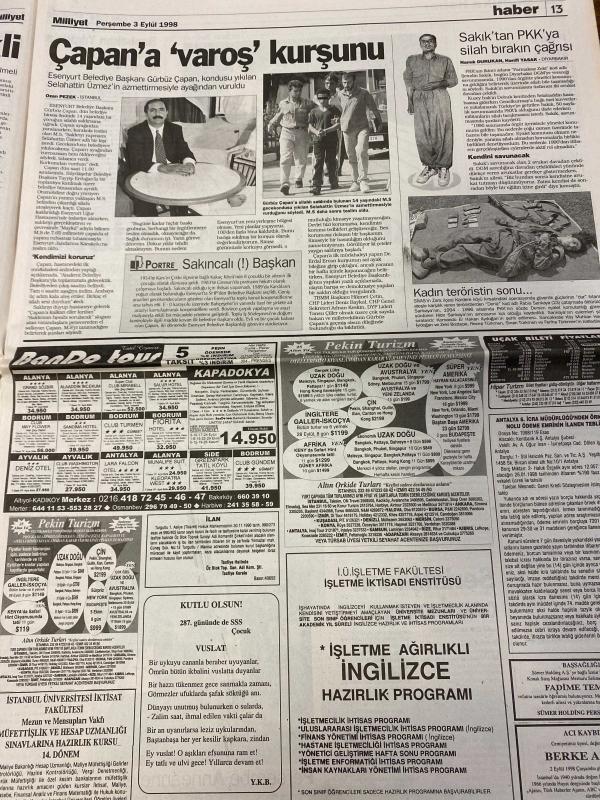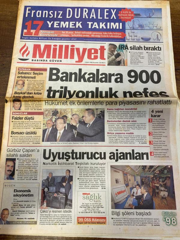 MİLLİYET GAZETESİ DOĞUM GÜNÜ HEDİYESİ - 3 EYLÜL 1998 - TAM TAKIM 32 SAYFADIR -Mesut Yılmaz-Deniz Baykal-Gürbüz Çapan-Alaattin Çakıcı-Hasan Pulur-Harun Gürek-Önder Yılmaz-Zülfikar Doğan-Şeref Oğuz-Abbas Güçlü-Onay Yılmaz-Tamer Heper Bankalara 900 trilyonluk nefes-Uyuşturucu ajanları-Bilgi şöleni başladı-G.Saray ayağa kalktı-Denizli’nin 8 bankosu-Burs isteyen çok veren yok-Uyuşturucuda NİT dönemi-Son yolculuk-Sarhoşun mangalı mahalle yakıyordu-Bankalar istediklerini aldı-Sakıp Sabancı-Osman Pezer-Hamdi Dumlupınar-Hamdi Yasak Genel seçimi ertelemek lazım-Gelişen piyasaların hızlı hisseleri-Çapan’a varoş kurşunu-Sakık’tan PKK’ya silah bırakın çağrısı, Ali Naci Karacan tarafından kaleme alınmıştır. MİLLİYET GAZETESİ DOĞUM GÜNÜ HEDİYESİ - 3 EYLÜL 1998 - TAM TAKIM 32 SAYFADIR -Mesut Yılmaz-Deniz Baykal-Gürbüz Çapan-Alaattin Çakıcı-Hasan Pulur-Harun Gürek-Önder Yılmaz-Zülfikar Doğan-Şeref Oğuz-Abbas Güçlü-Onay Yılmaz-Tamer Heper Bankalara 900 trilyonluk nefes-Uyuşturucu ajanları-Bilgi şöleni başladı-G.Saray ayağa kalktı-Denizli’nin 8 bankosu-Burs isteyen çok veren yok-Uyuşturucuda NİT dönemi-Son yolculuk-Sarhoşun mangalı mahalle yakıyordu-Bankalar istediklerini aldı-Sakıp Sabancı-Osman Pezer-Hamdi Dumlupınar-Hamdi Yasak Genel seçimi ertelemek lazım-Gelişen piyasaların hızlı hisseleri-Çapan’a varoş kurşunu-Sakık’tan PKK’ya silah bırakın çağrısı adlı eser Türkçe dilindedir.