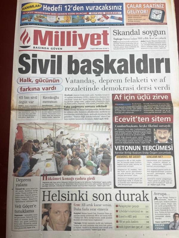 MİLLİYET GAZETESİ DOĞUM GÜNÜ HEDİYESİ - 3 EYLÜL 1999 - TAM TAKIM 30 SAYFADIR -Hüseyin Kıvrıkoğlu-Bülent Ecevit-Hikmet Çetin-İsmail Cem-Hüsamettin Özkan-Hasan Cemal-Güneri Cıvaoğlu-Rafet Aslan-Halil Özer-Vedat Danacı-Gökhan Türe-Erdoğan Şenay-Bilal Meşe-Doğan Koloğlu-Altuğ Atalay-Kartal Yiğit-Afşin Yakuboğlu-Sina Koloğlu-Erman Şener-Bilal Meşe-Haluk Kırcaali-Fatih Terim-Mustafa Doğan-Faruk Süren-Yorgo Batatoudis-Hikmet Çetin-Karolos Papoulias-Mustafa Denizli-Niall Quinn-Abdullah Doğan-Vedat Okyar-Rıdvan Dilmen-Murat Yakın-Fuat Yaman-Tayfur Havutçu-Kevin Keegan-Mustafa Er-Şenol Güneş-Fahri Karagözoğlu-Hikmet Karaman-Mustafa Reşit Akçay-Mustafa Er-Tarık Tüfekçioğlu-Spor yazarları-Ergün Attar-Murat Belge-Kaan Kural-Sadi Karagözoğlu-Mustafa Çakar-Mustafa Denizli’den çalım-Mustafa Doğan şoku-Sırtımdan vuruldum-Bu dostluk bitmesin-Sivil başkaldırı-Helsinki son durak-TV’nin önlenemeyen yükselişi-Türk Yunan barış köprüsü-Bu dostluk bitmesin-Denizli’den çalım-Haydi Ümitler-Hedef Beşiktaş adlı eser, Kitap > Süreli Yayınlar > Gazeteler > Türkiye > Genel > Günlük kategorisinde İkinci El olarak satıştadır.